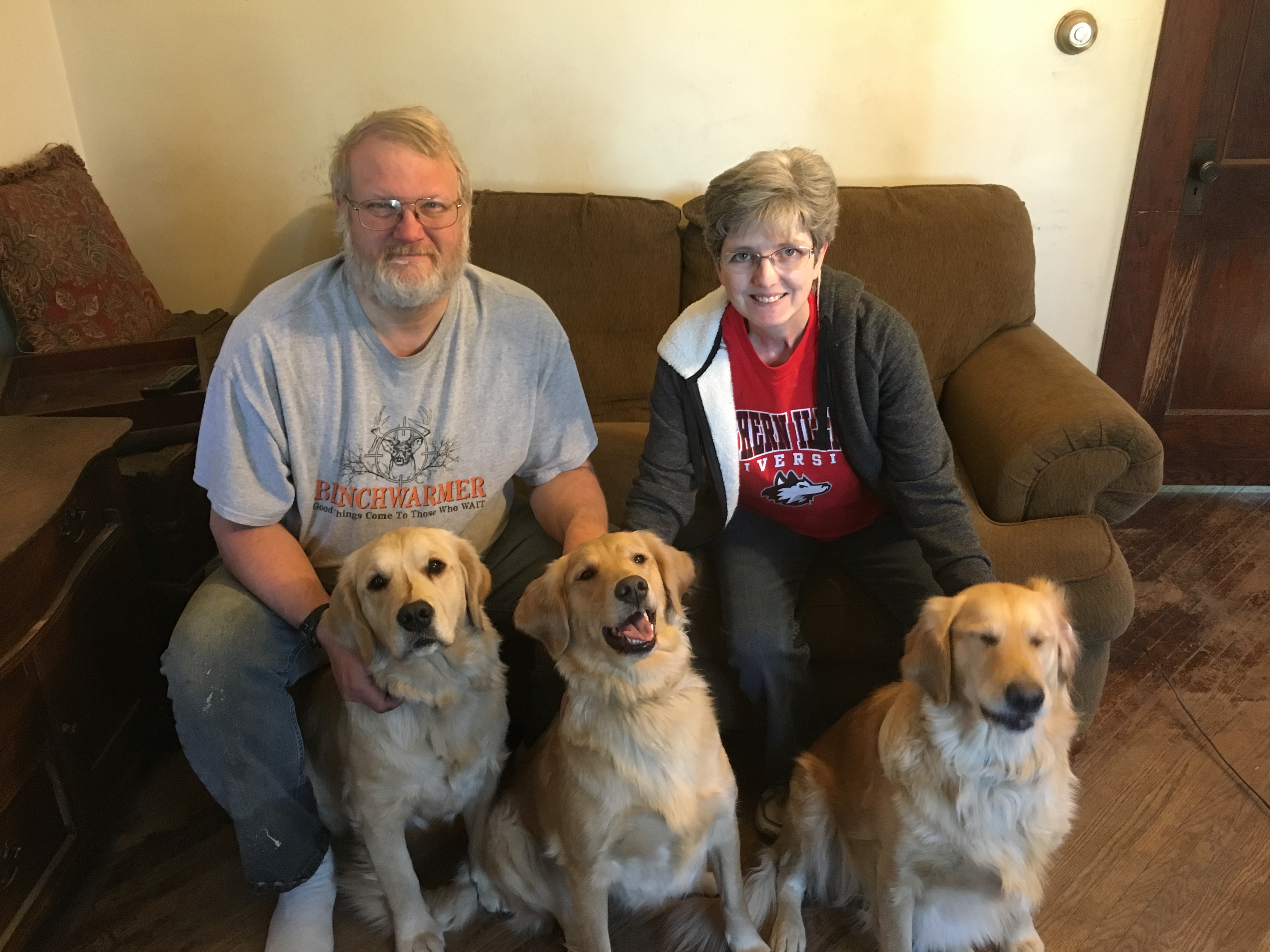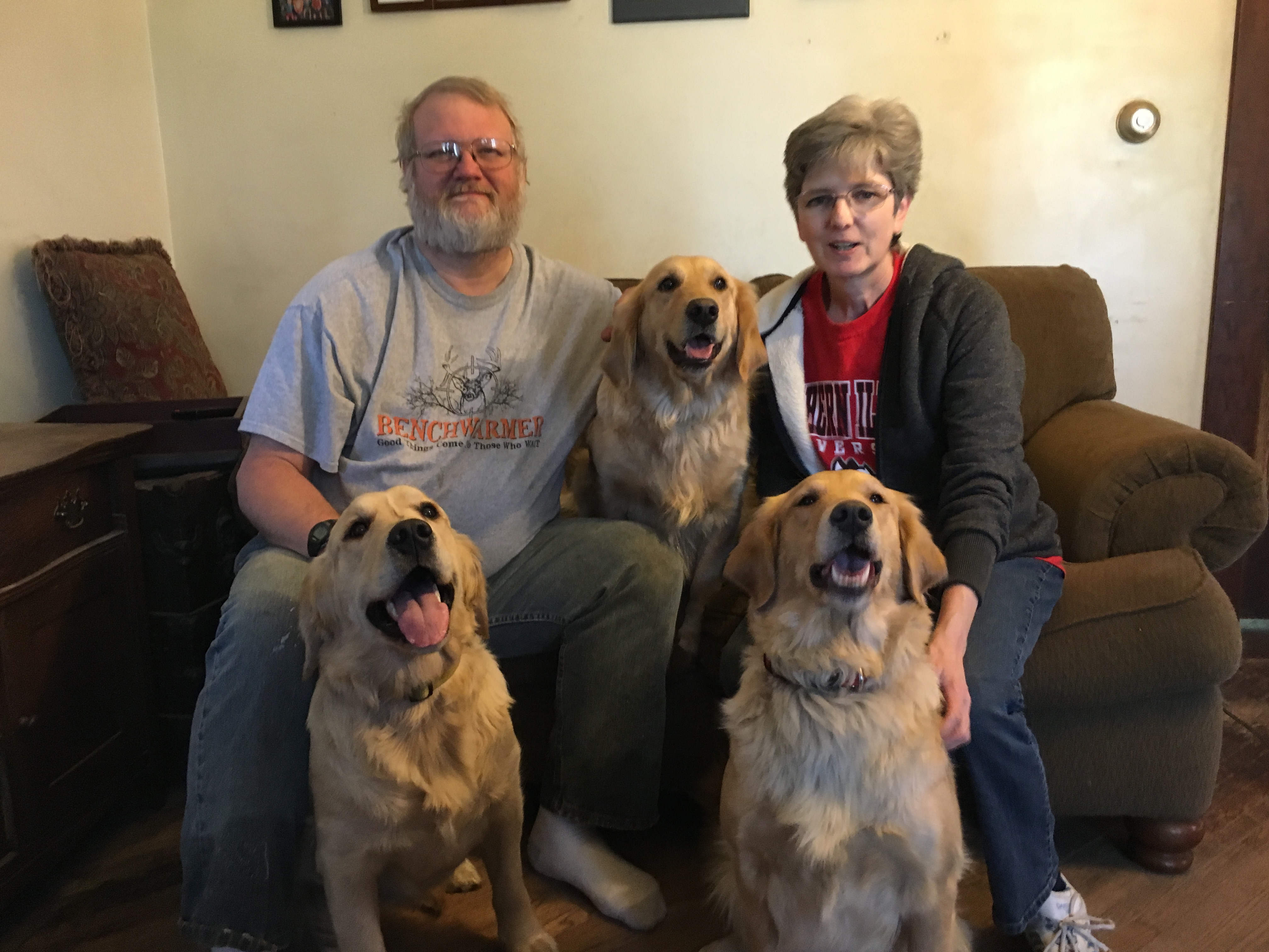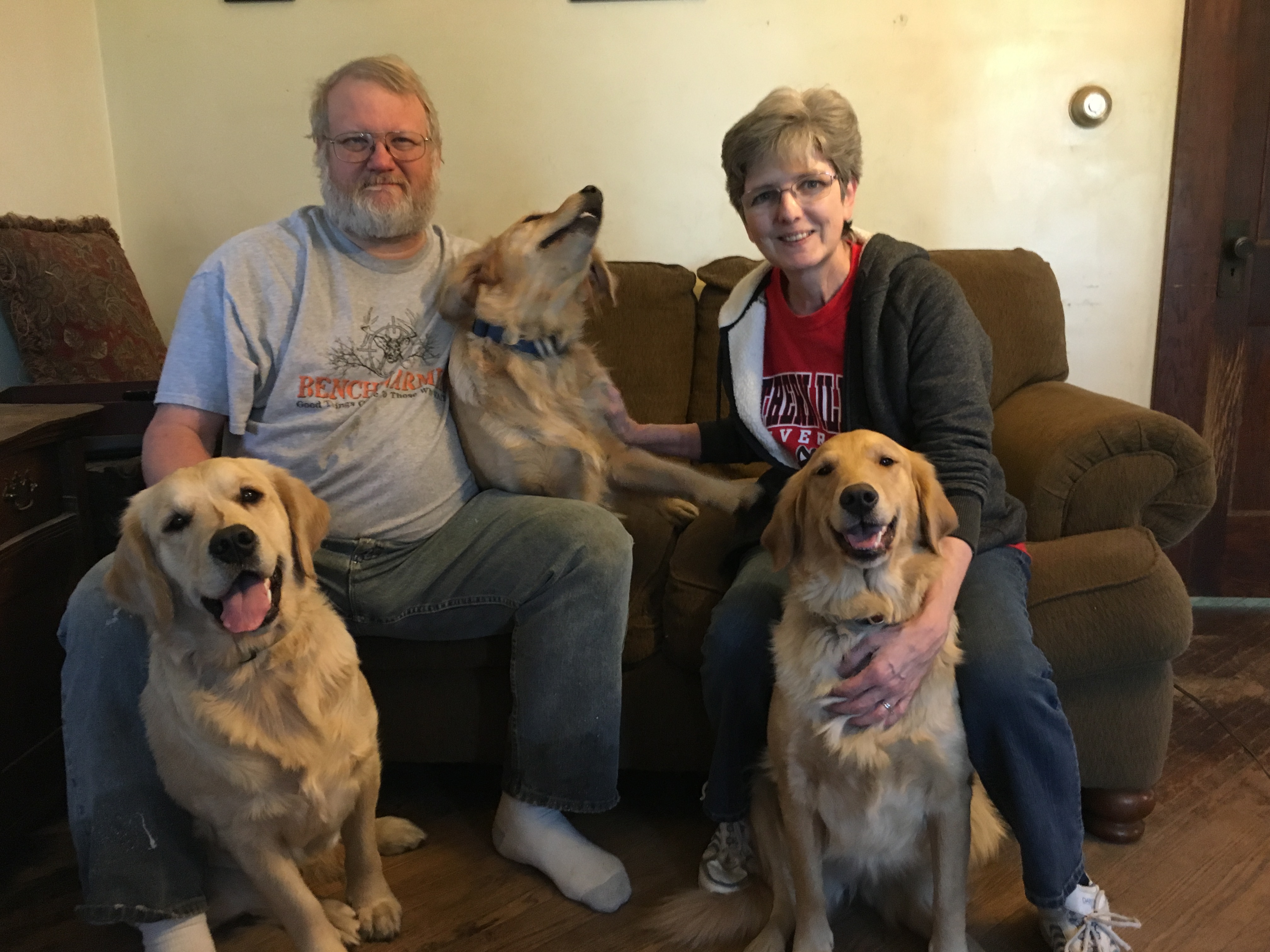 We don’t have any photos with Greg and I and the pups, today that was remedied. What I envisioned as a lovely photo in reality was well…real, really, really real. It turns out that it wasn’t Bouncy Bess that was the challenge but Belle the Stinker otherwise known from this day forward as Stinker Belle.