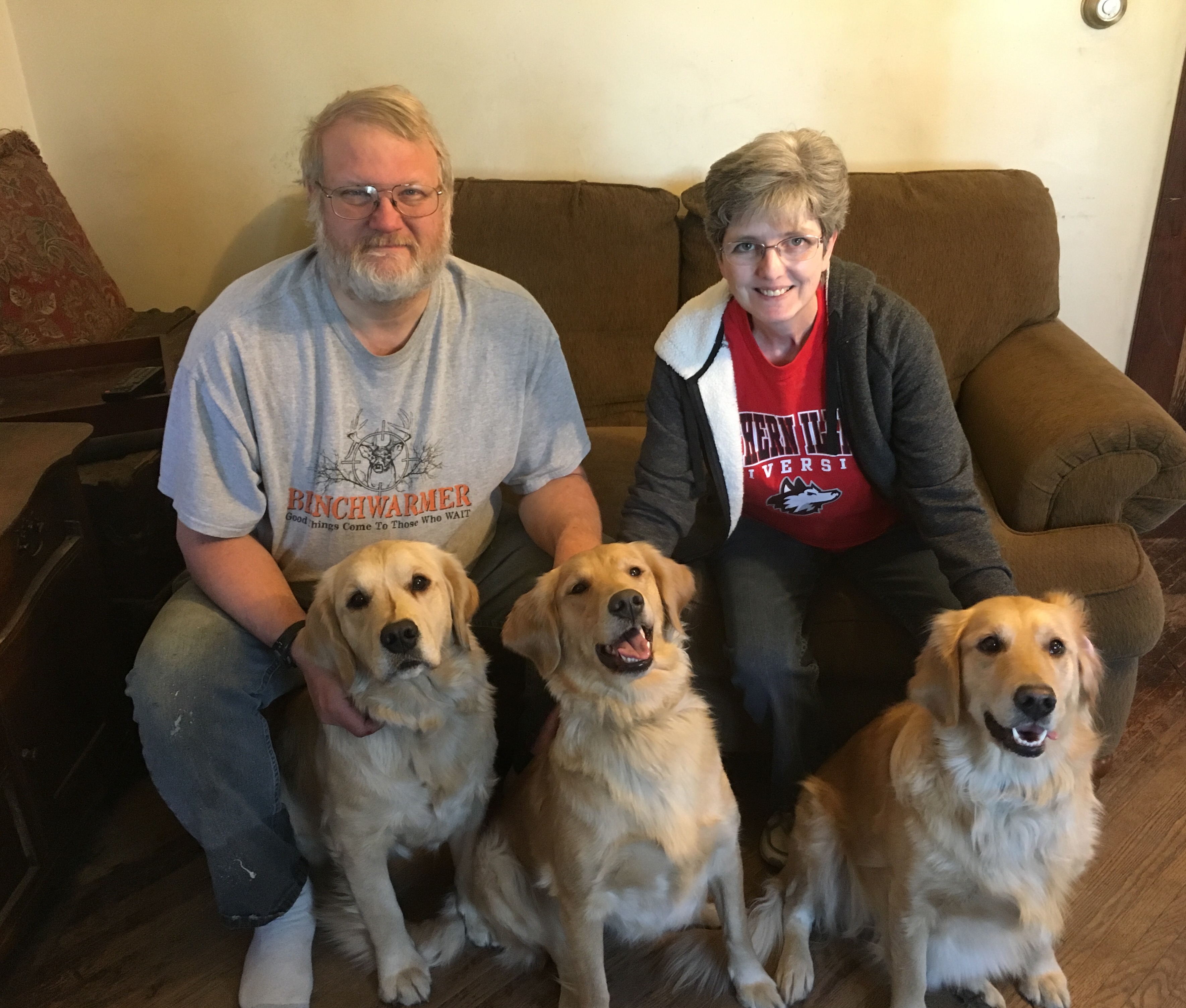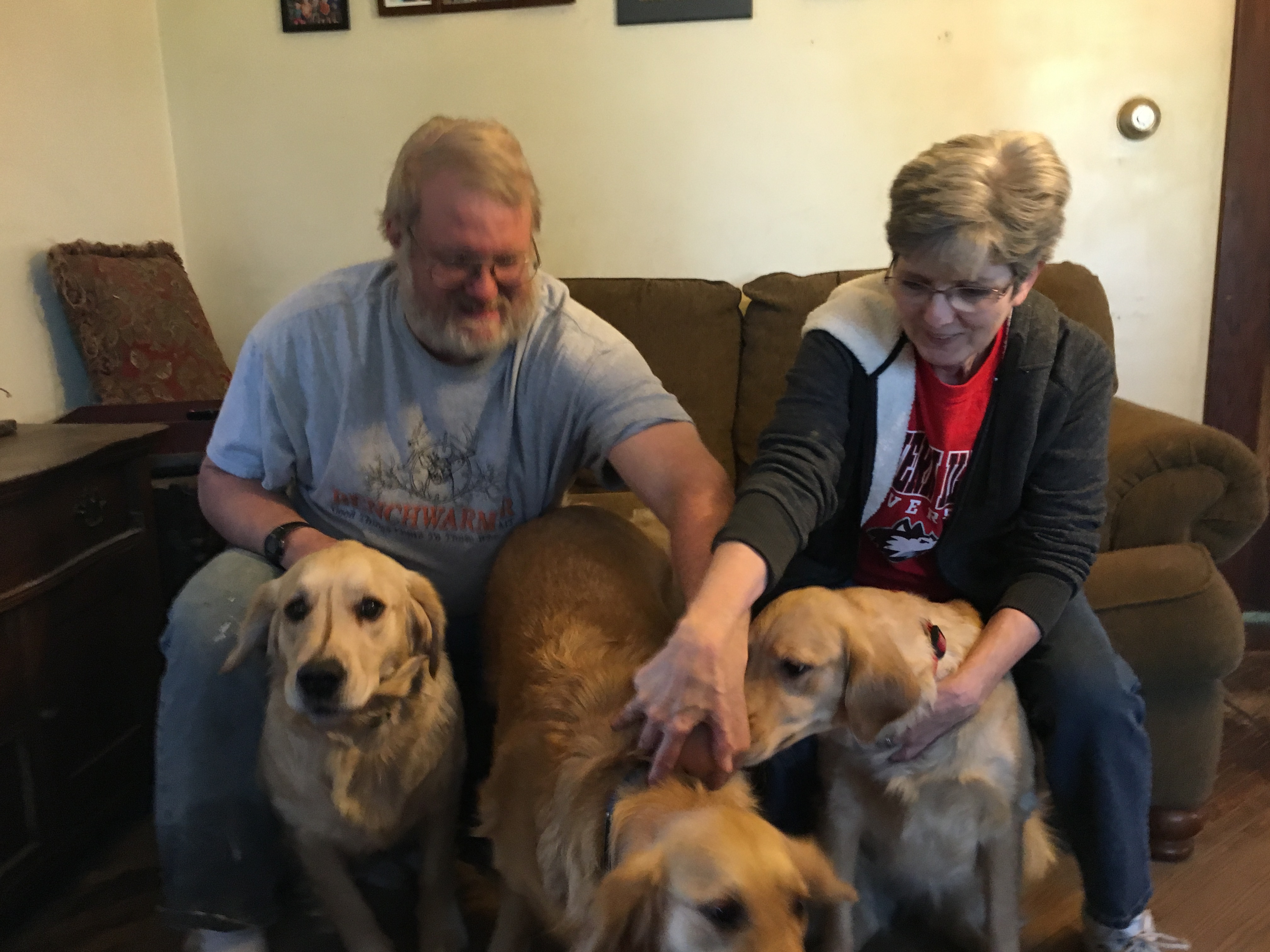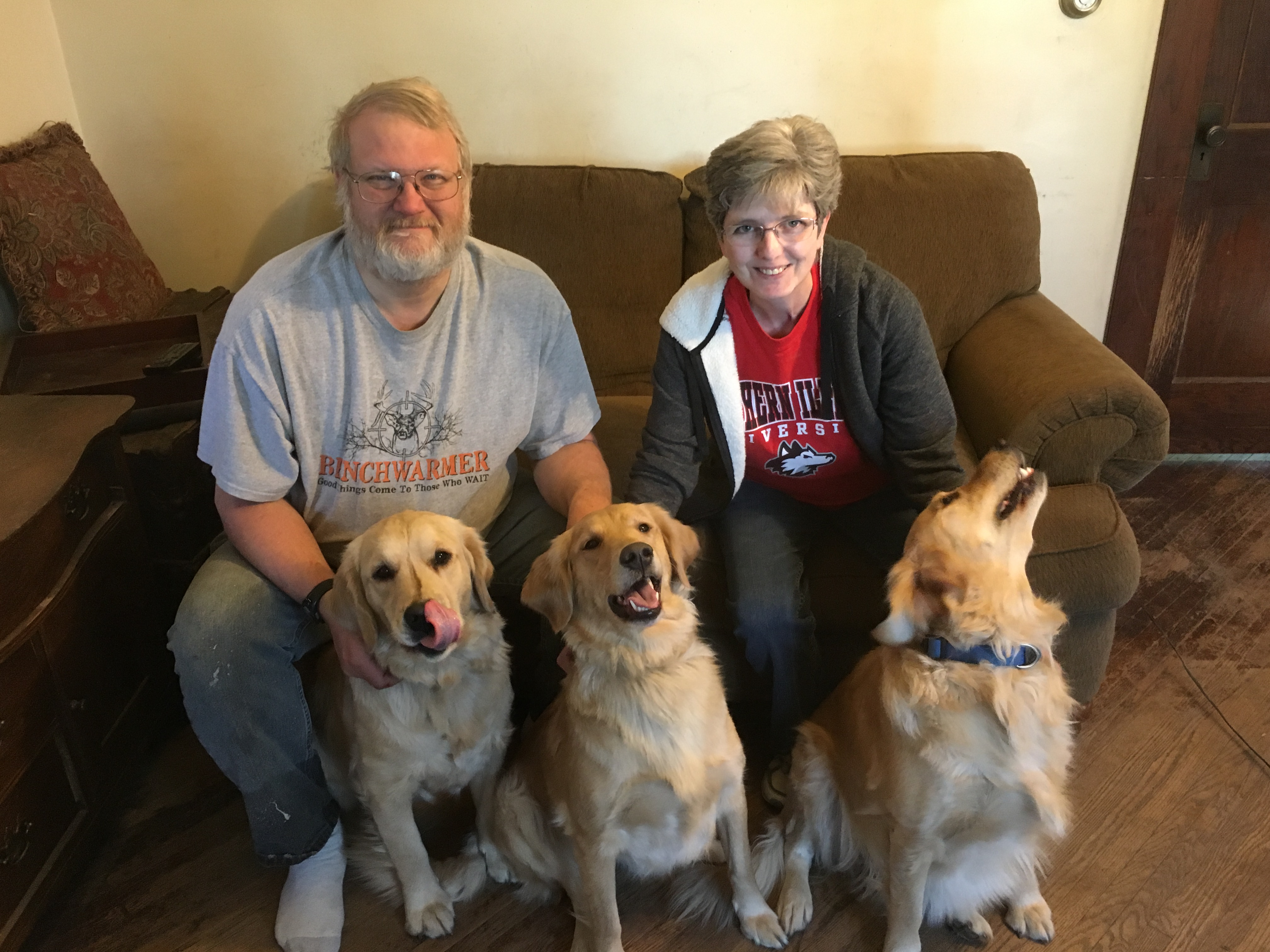 We don’t have any photos with Greg and I and the pups, today that was remedied. What I envisioned as a lovely photo in reality was well…real, really, really real. It turns out that it wasn’t Bouncy Bess that was the challenge but Belle the Stinker otherwise known from this day forward as Stinker Belle.