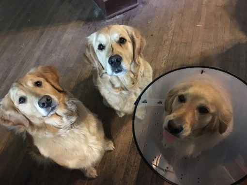 Aww, Belle, not you too! Mom said if my sock didn’t work that I would also have to wear the cone, so I mostly left the sock alone. Piper, however, is still wearing his. Hey, you two oughta have your pictures made together and call it the Coneheads! (Sorry.)