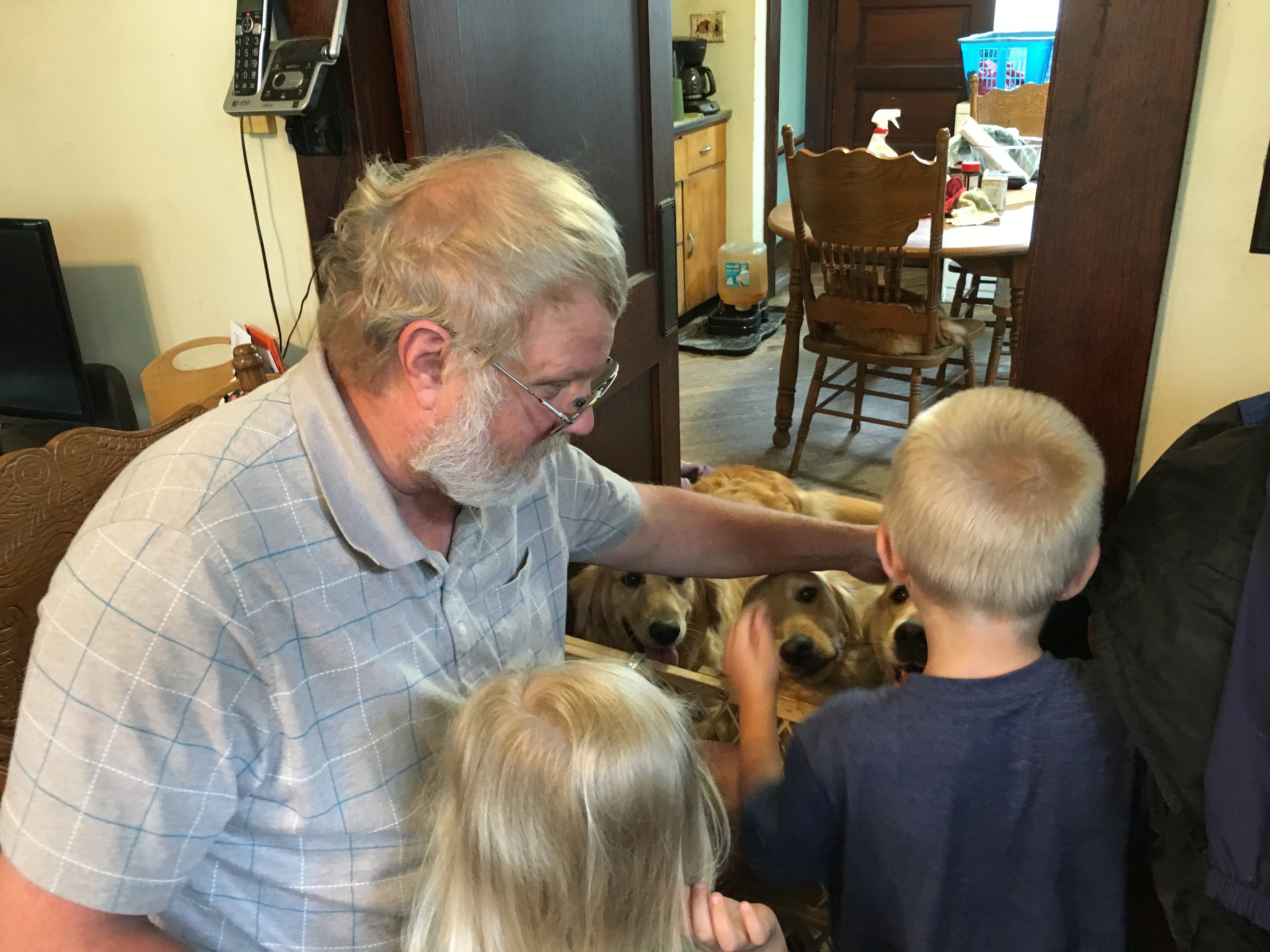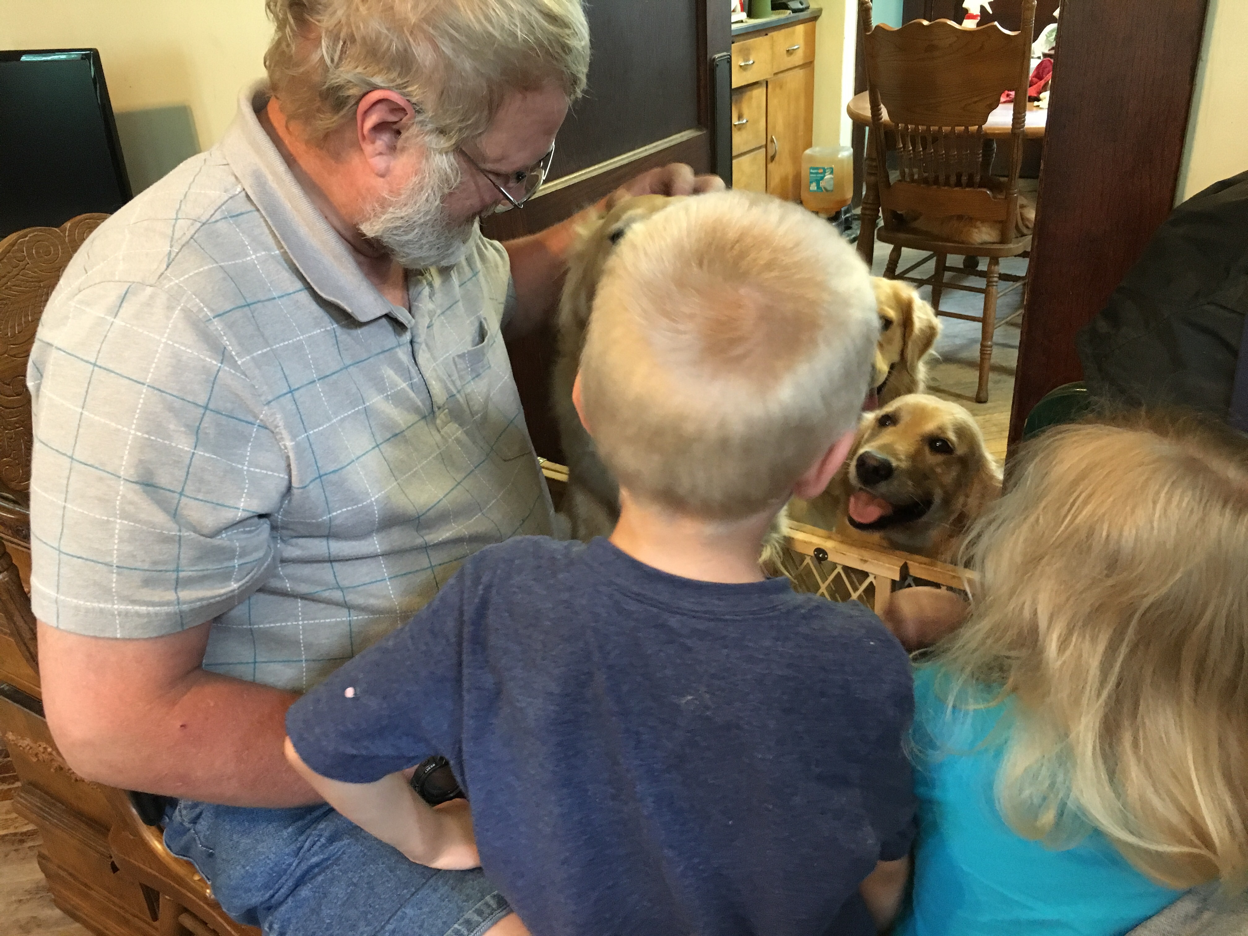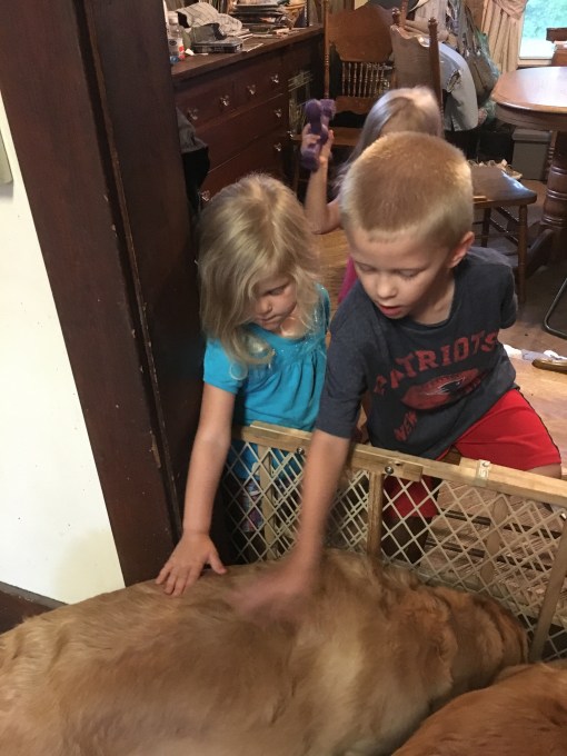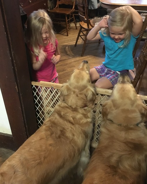 So some of My Margret and My Greg’s little people came to visit this weekend.  Because although we are doing better we sometimes still jump up on people when we are happy to see them we couldn’t be in the same room with the little people. But because it was very hot and because the little people wanted to see us My Margret fixed us up in the kitchen.