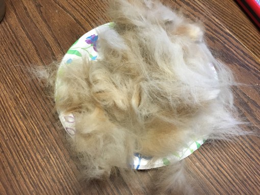 Then a little while later My Greg started to brush me.  He said nice things to me too so I let him brush me…for a little while.  This is how much of my fur came out.