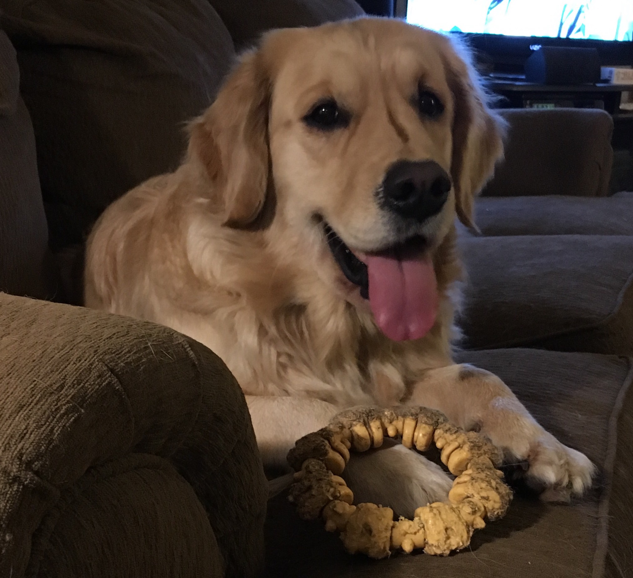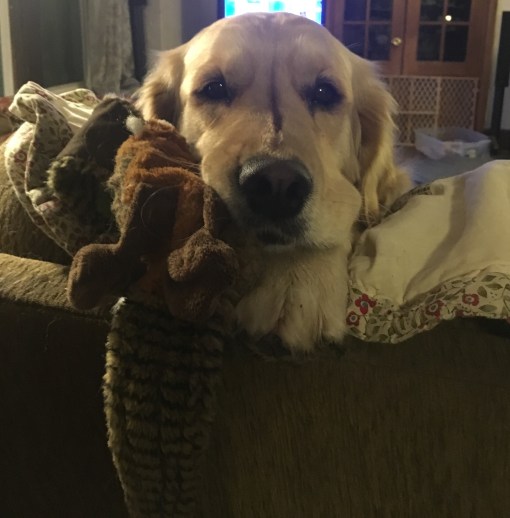 I went back out and played more in the snow and was so excited that when I came back in I raced into the kitchen, through the dining room into the living room where I grabbed two of my stuffies and jumped up on the couch and hung over the back of the couch and said hi to My Margret. She laughed and said that I was full of joyful bouncyness.