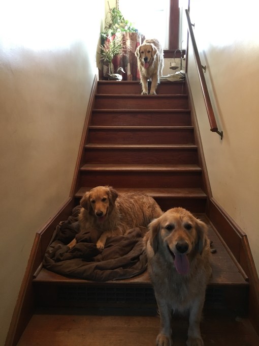 My Margret is trying to get us used to the blow dryer. She told us we would get dryer faster but it’s loud so we don’t like it.