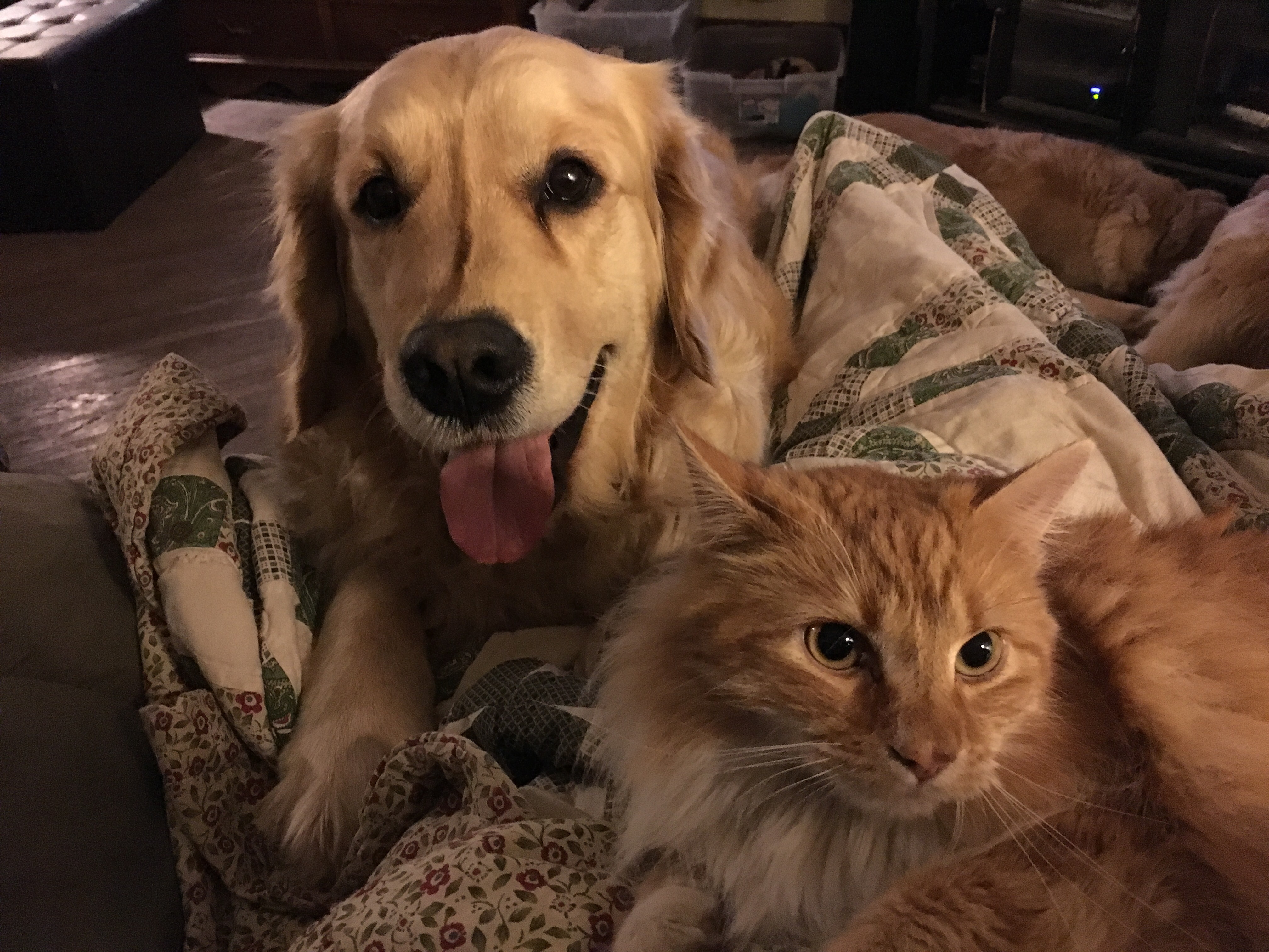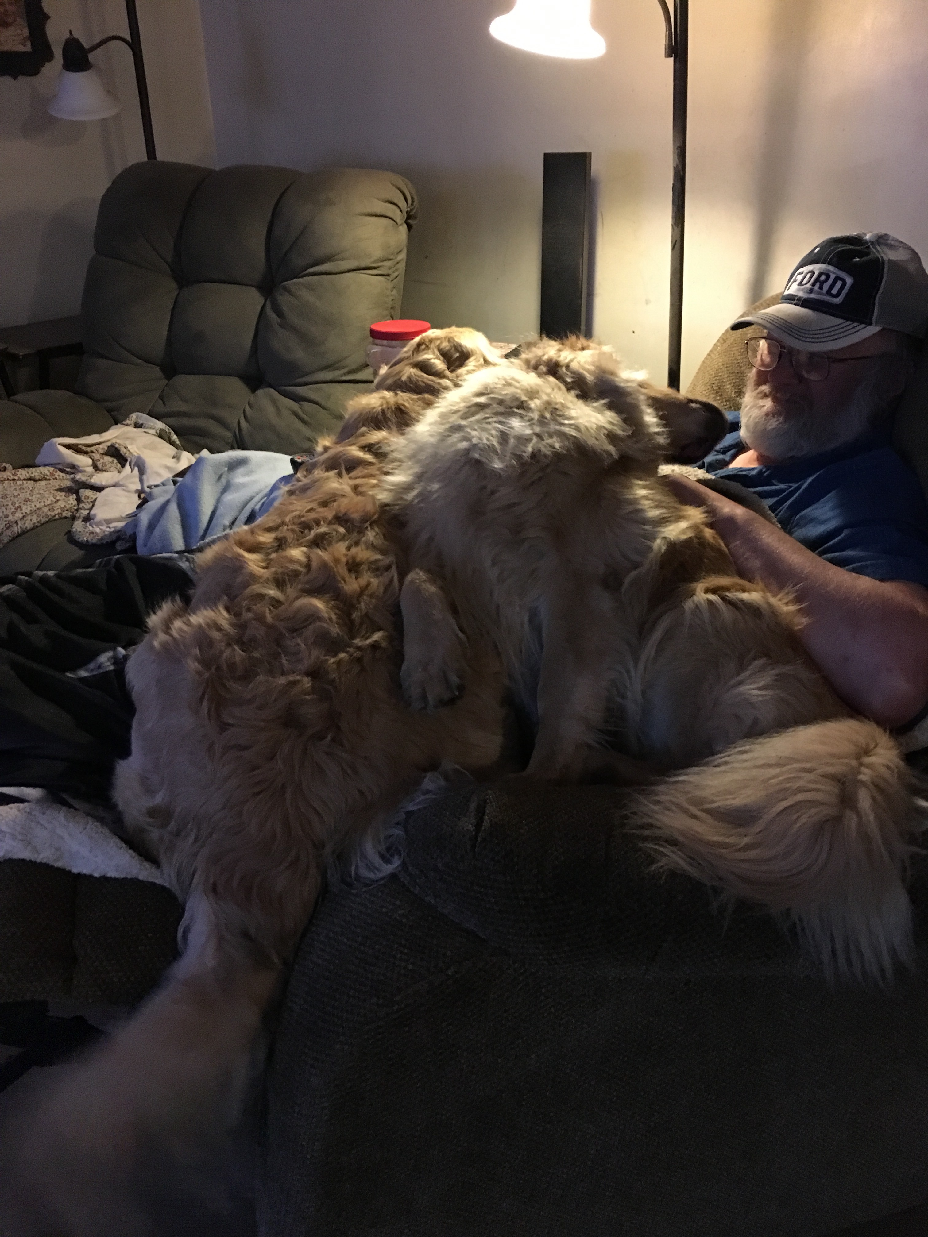 Lots of blonde fur including a little blonde hair from Greg! — because of Belle’s ears — guess having ears taken care of can cause a lot of good cuddling. Greg doesn’t need the furnace as much!