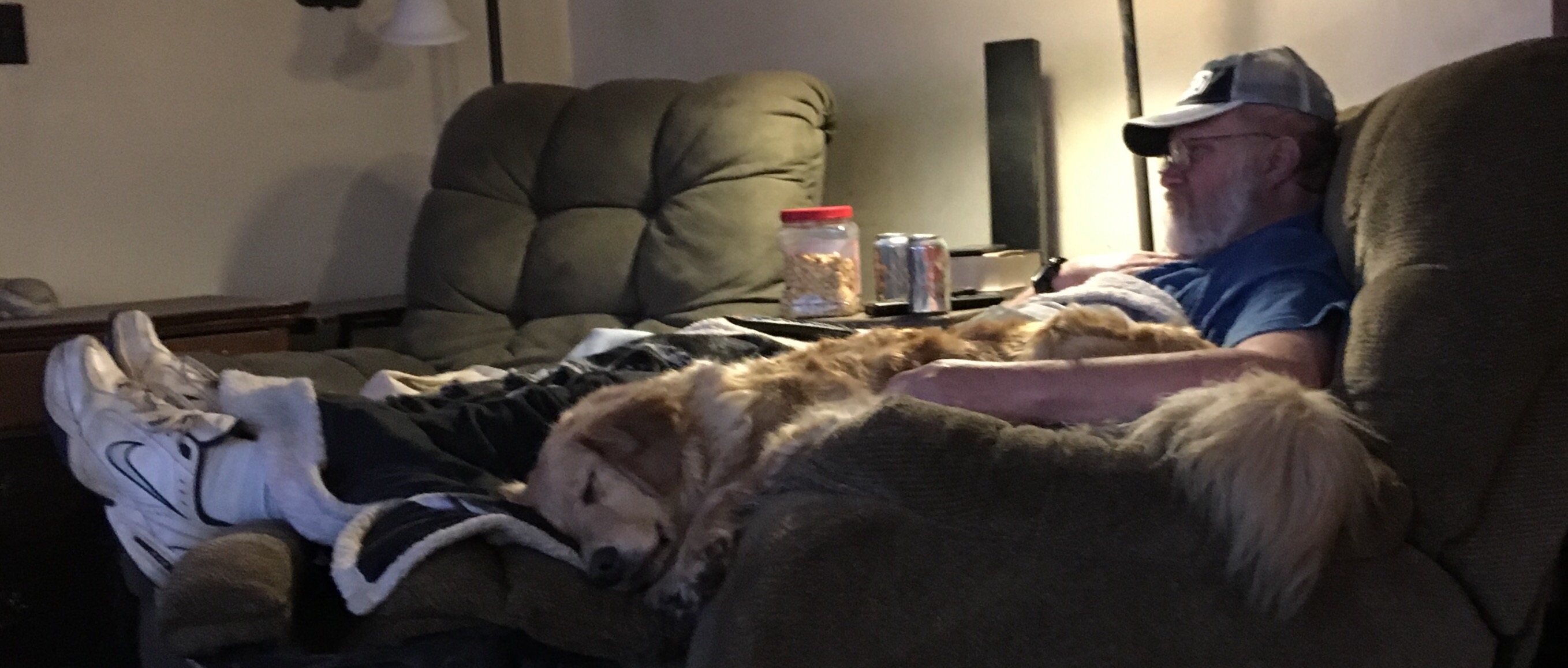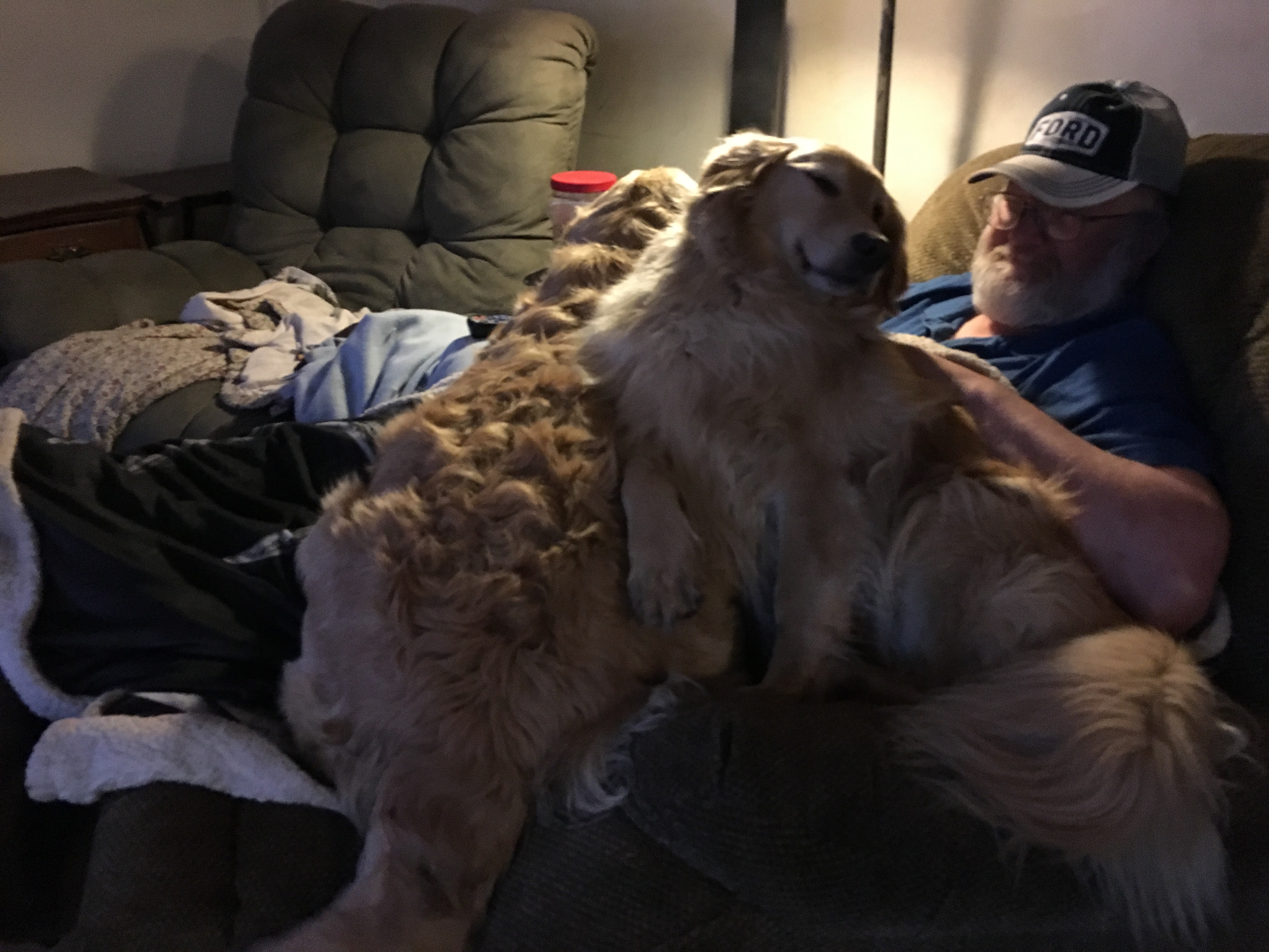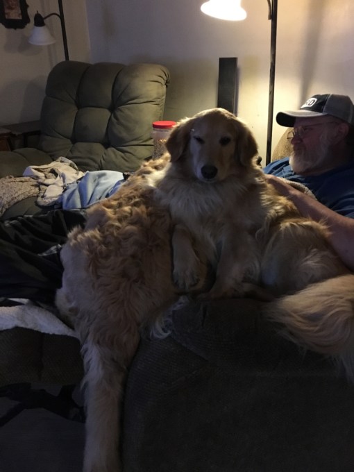Looks like about 100 pounds of dog in Your Greg’s lap. I am glad your ears are doing better, Belle. Lucy also had to have meds in her left ear this past week, but all looks good now. P.S. Please don’t tell her you got cheese.