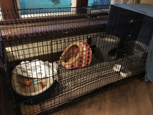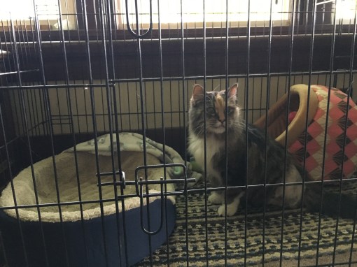 Lucy is already showing signs of the insignificance of the loss of that leg for her. How wonderful! You will all get used to it soon. Looks like her new, temporary digs are spacious and comfortable, even if she doesn’t appreciate being confined. I’m glad Linus is keeping her company.
