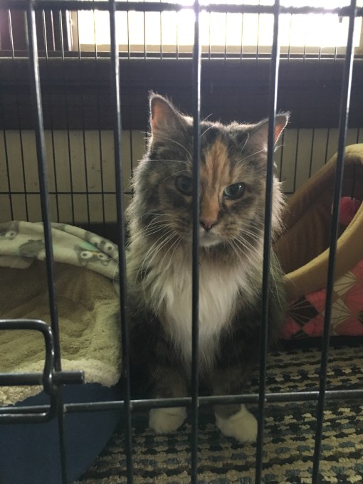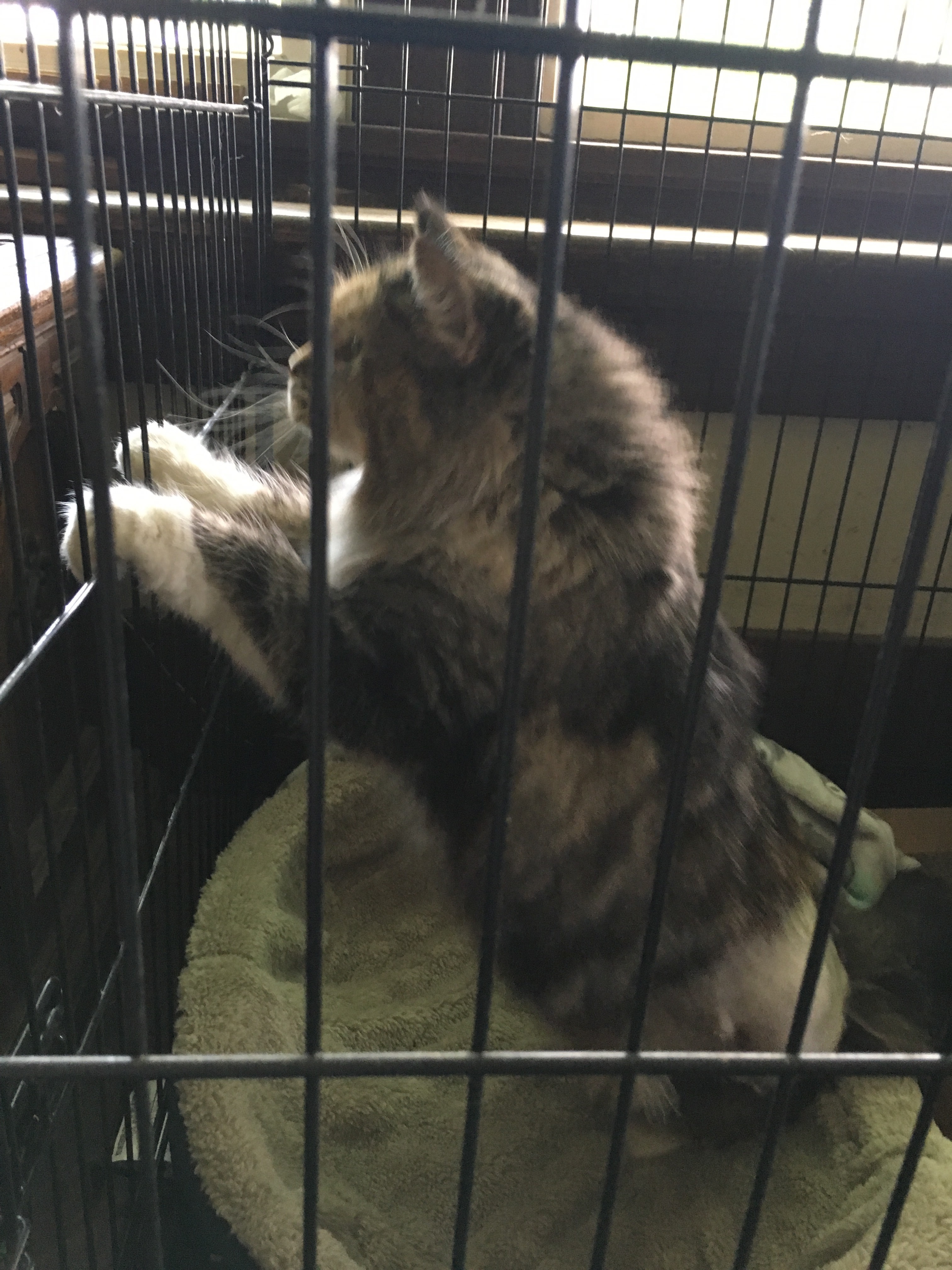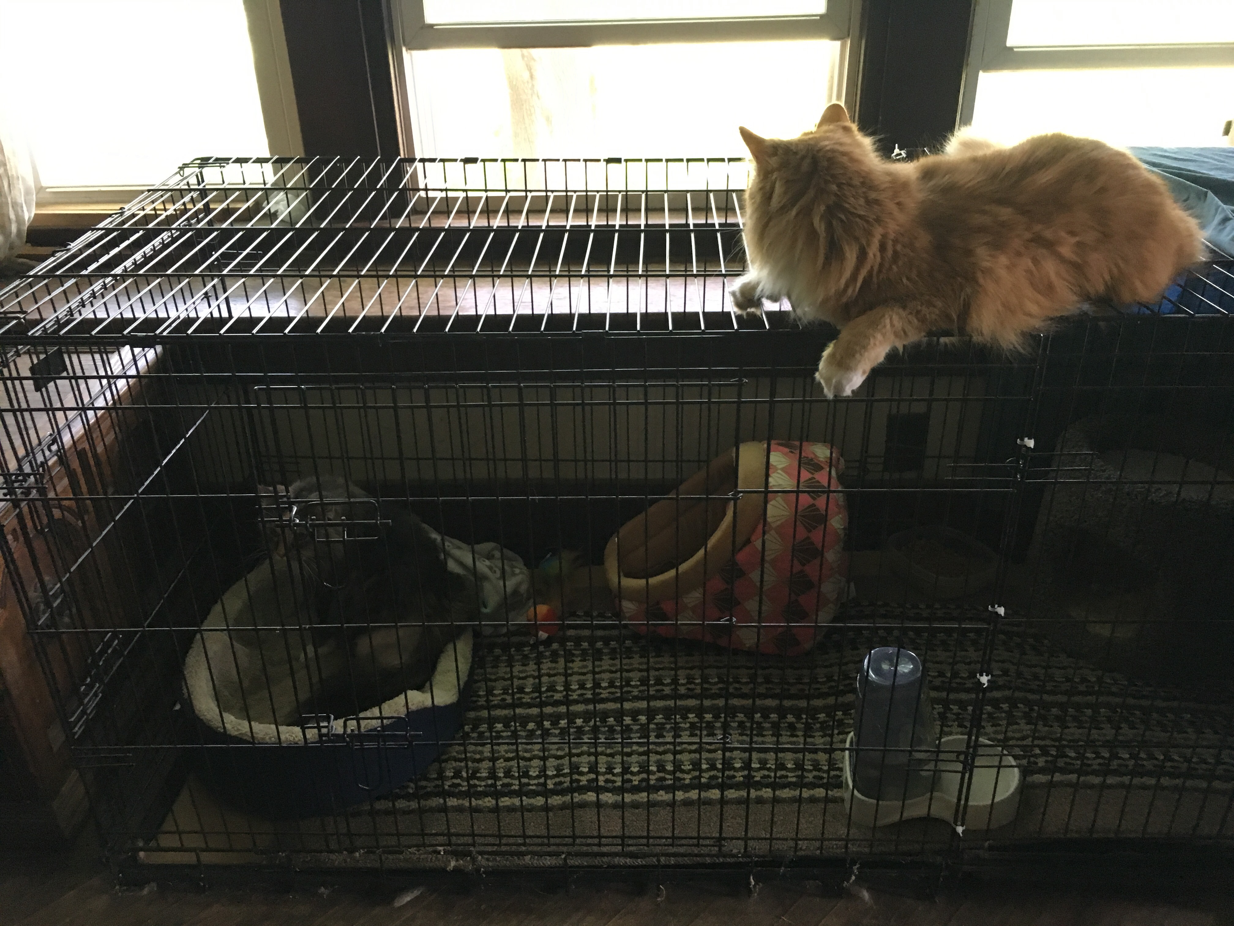 Lucy is already showing signs of the insignificance of the loss of that leg for her. How wonderful! You will all get used to it soon. Looks like her new, temporary digs are spacious and comfortable, even if she doesn’t appreciate being confined. I’m glad Linus is keeping her company.