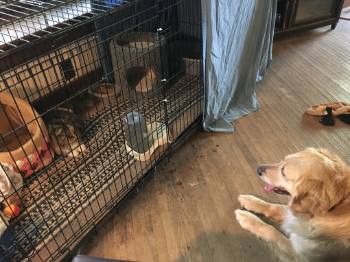 We have been using “leave it”, ” find it”, body blocking and treat filled Kongs to help the pups learn how to act around a senior kitty.   Bess Pup is responding well and after an initial round of barking when she first enters the room to let us know that Lucy is there settles down and pretty much ignores her. Bonnie Pup checks her out every now and then but for the most part leaves her alone. And Belle ah sweet Belle Pup goes between checking on Lucy and wanting to join her in the crate. Belle has always loved her crate.
