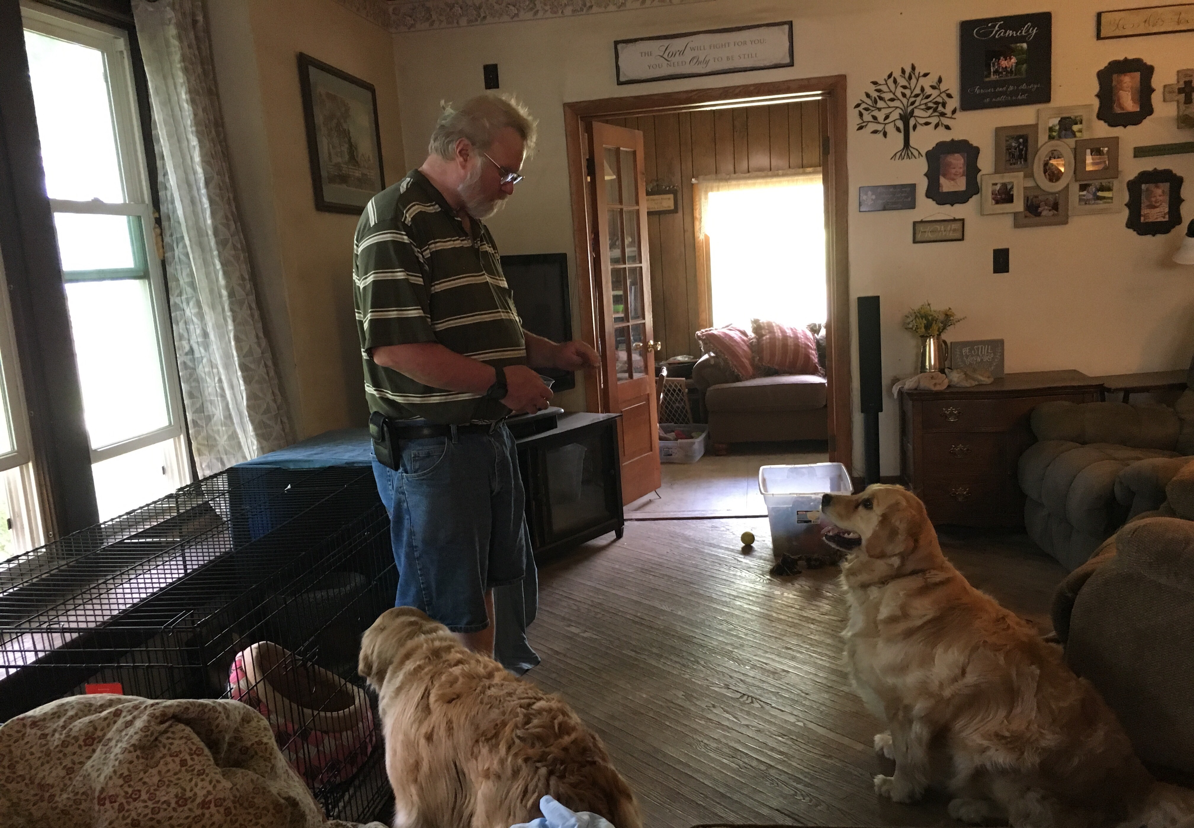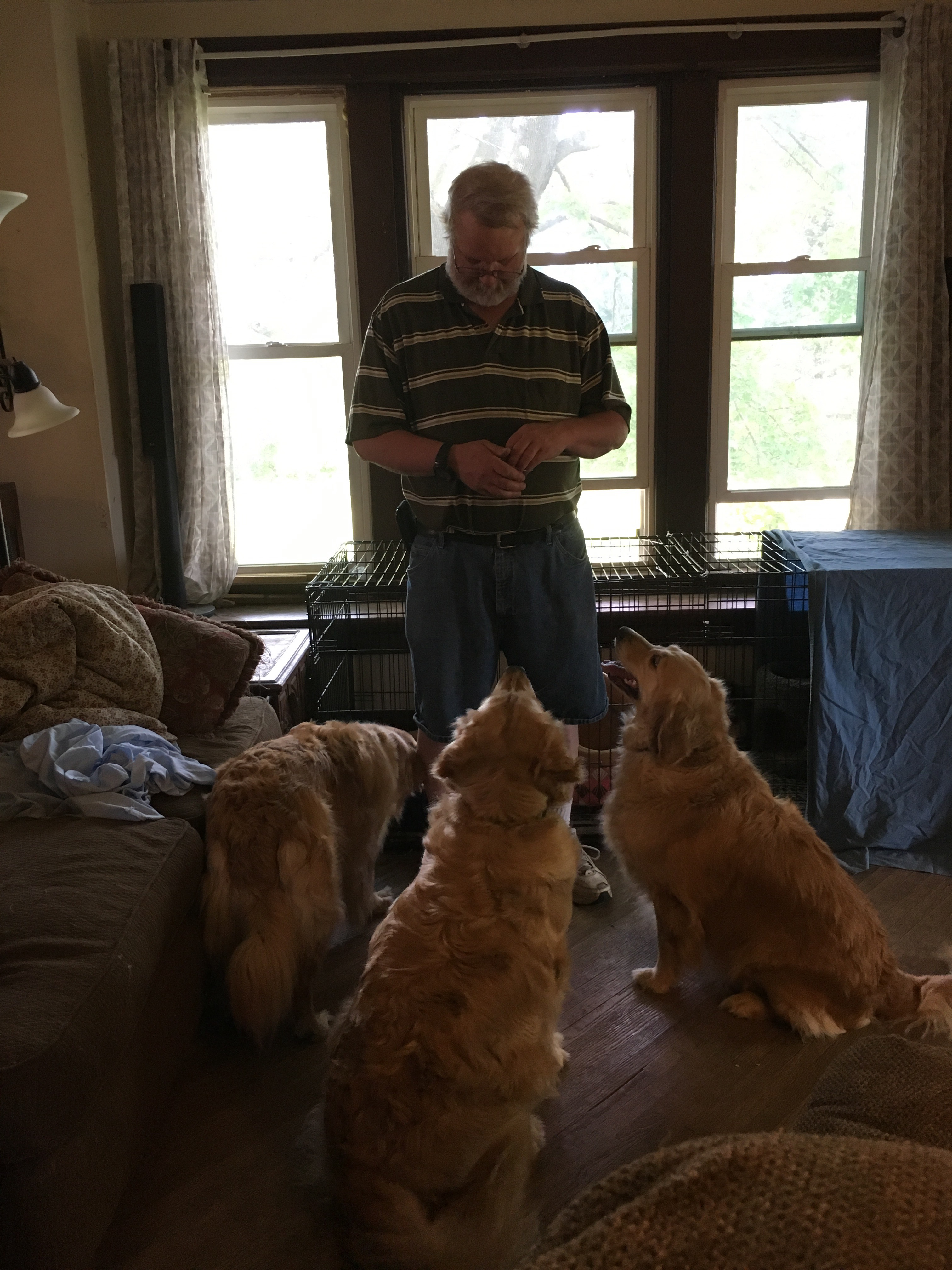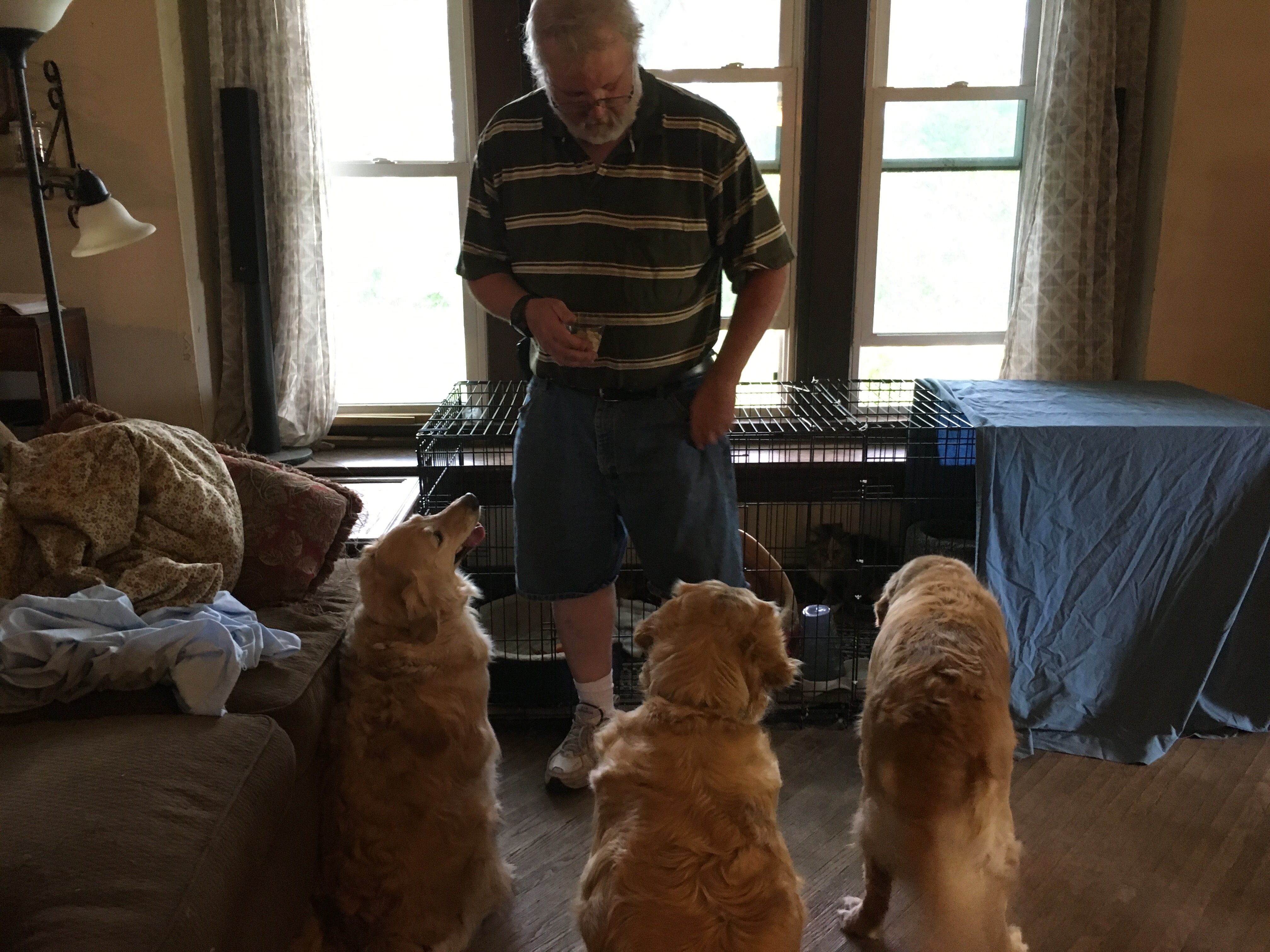 We have been using “leave it”, ” find it”, body blocking and treat filled Kongs to help the pups learn how to act around a senior kitty.   Bess Pup is responding well and after an initial round of barking when she first enters the room to let us know that Lucy is there settles down and pretty much ignores her. Bonnie Pup checks her out every now and then but for the most part leaves her alone. And Belle ah sweet Belle Pup goes between checking on Lucy and wanting to join her in the crate. Belle has always loved her crate.