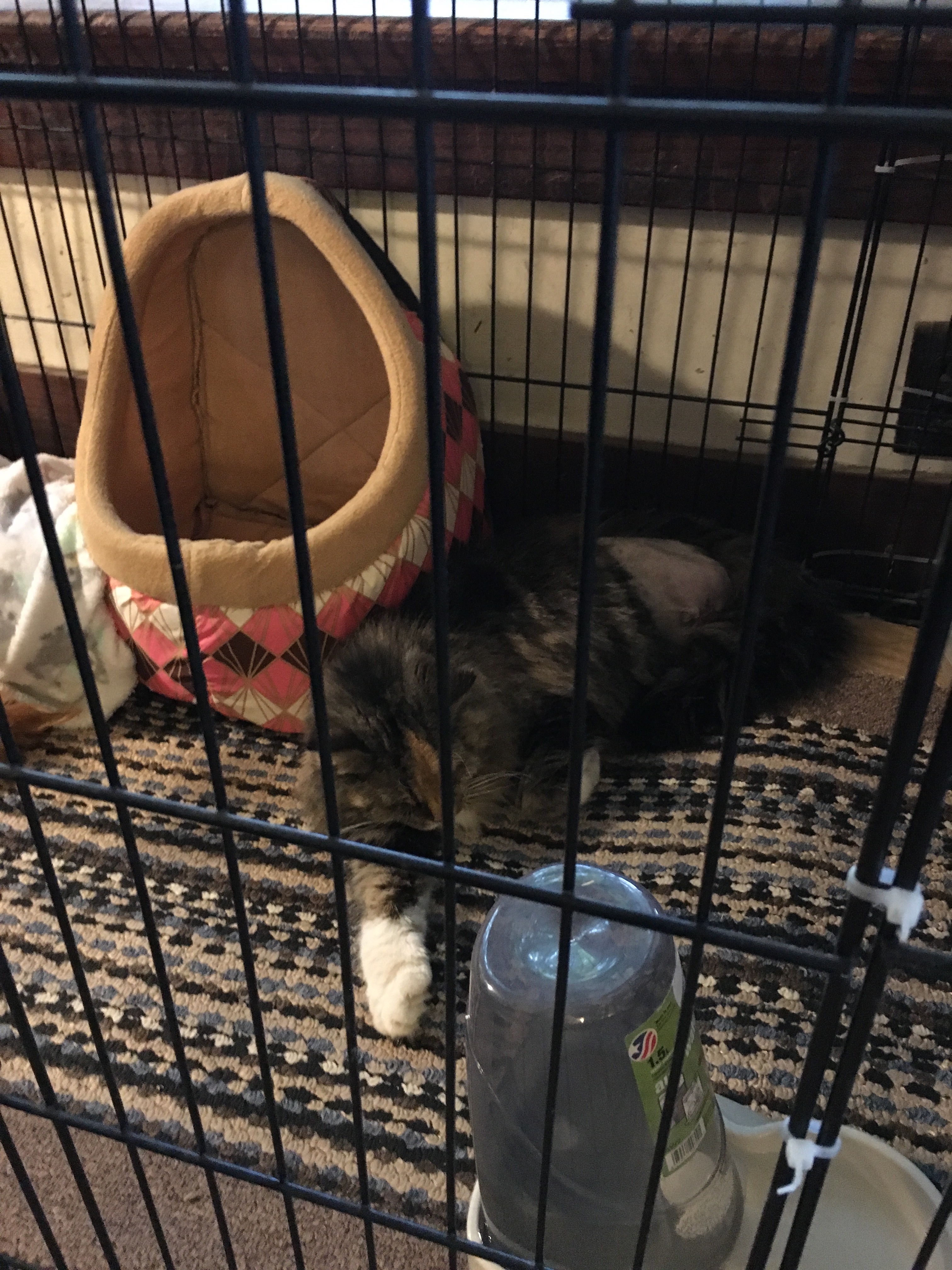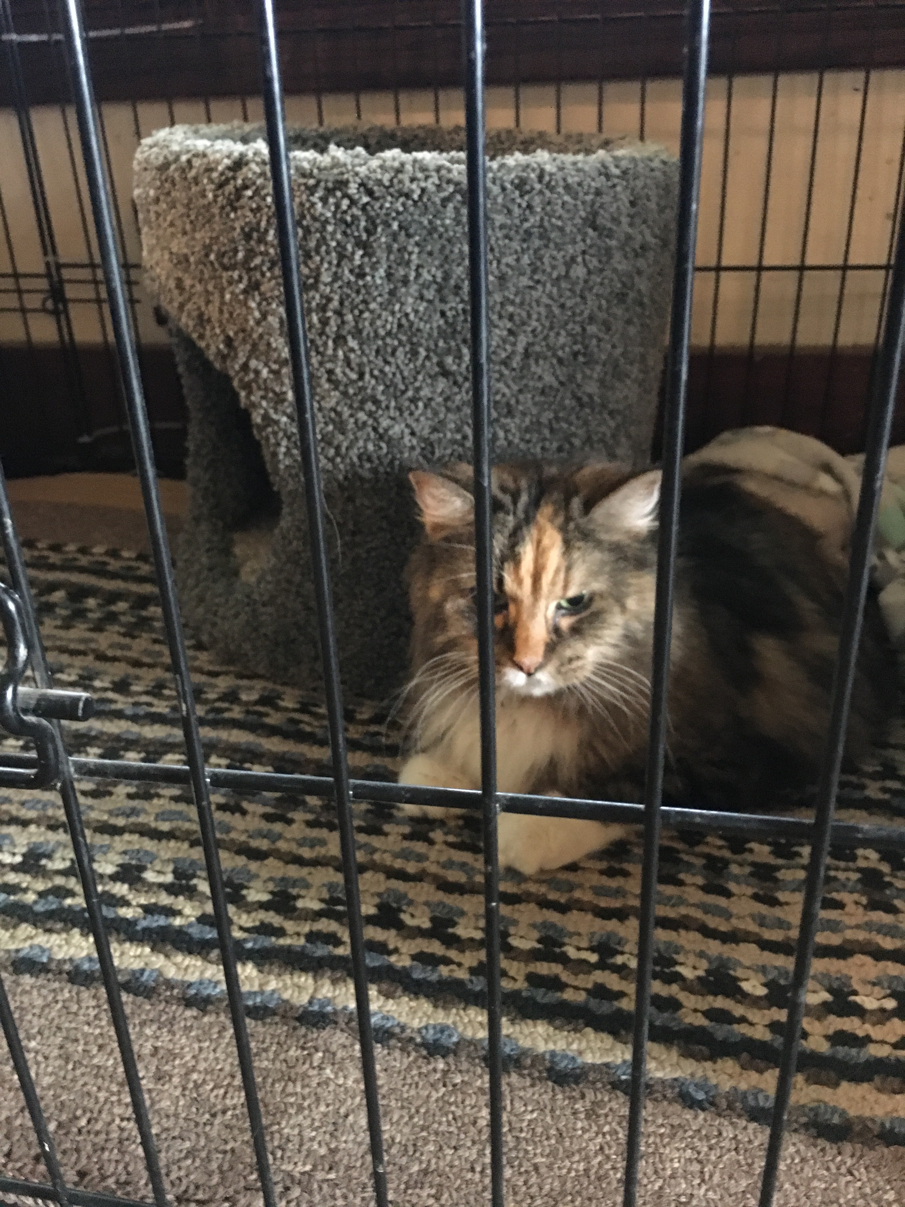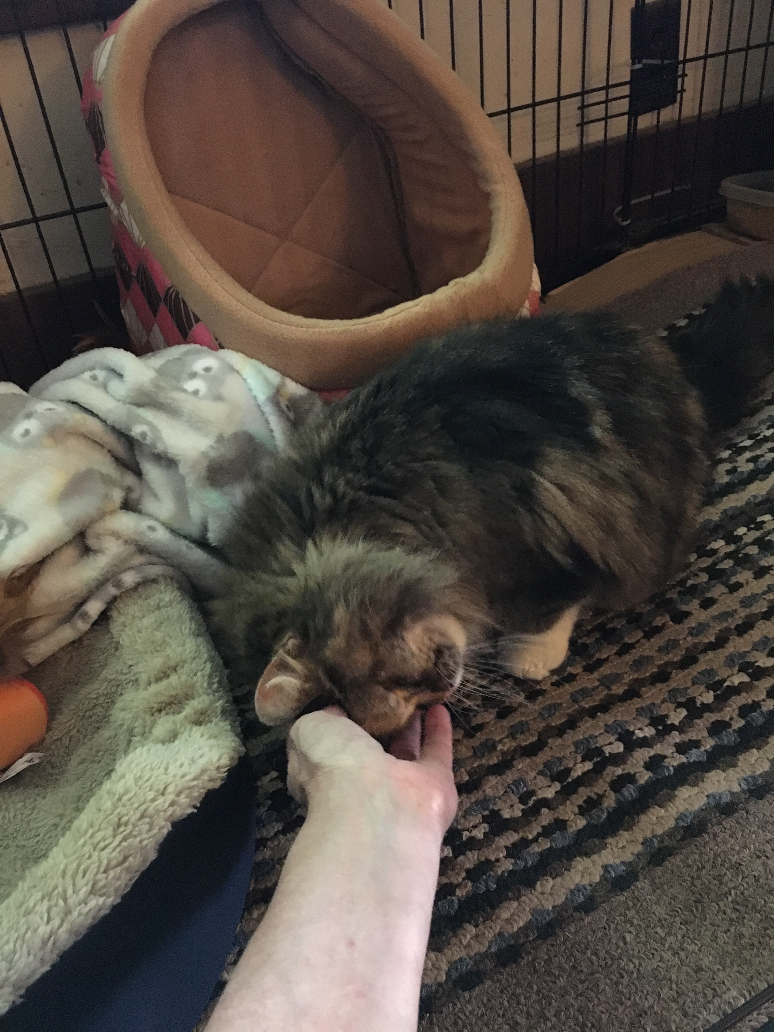 Lucy is enjoying ear scratches, gentle cuddles and carries on conversations with us as verbal kitties do.