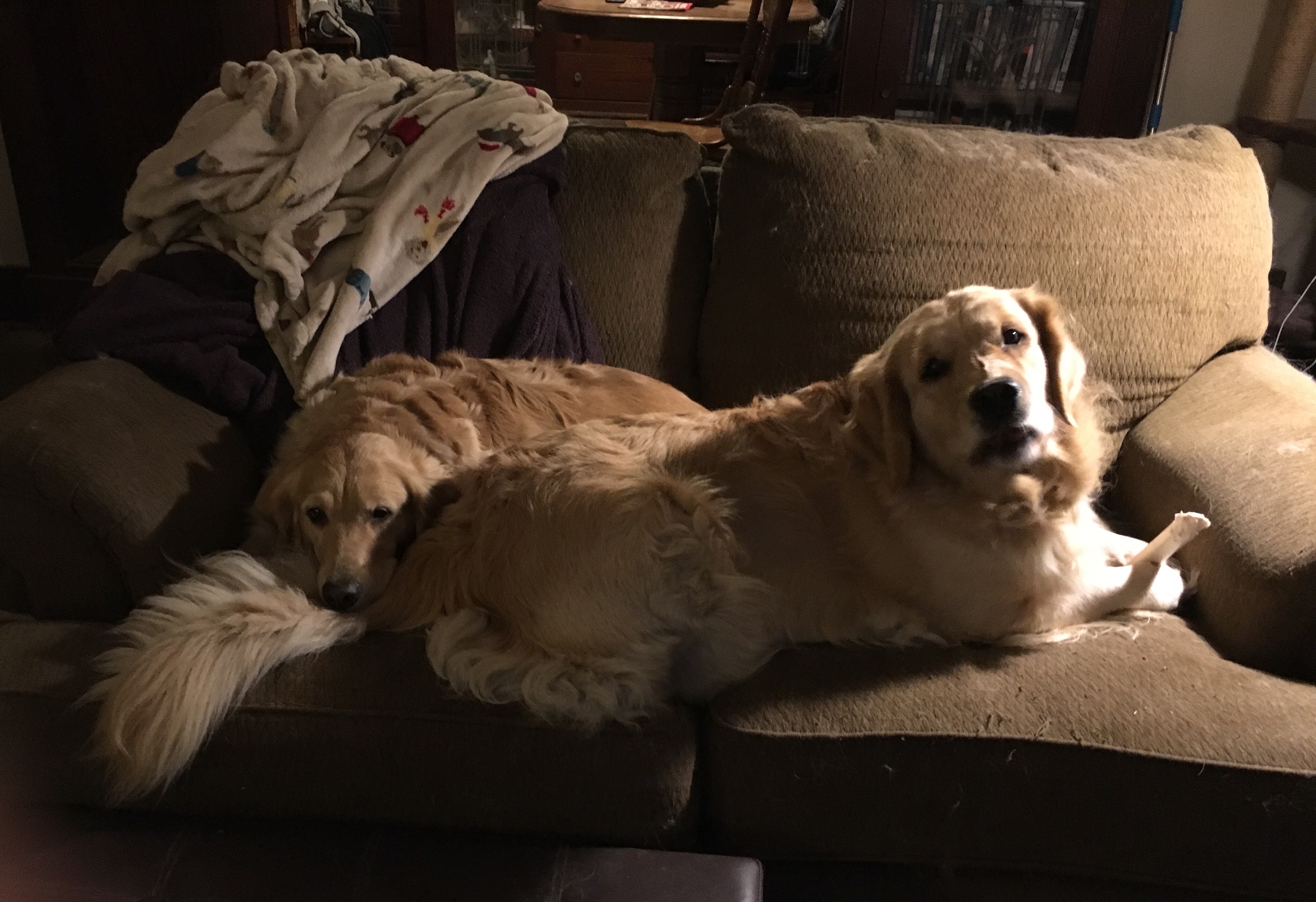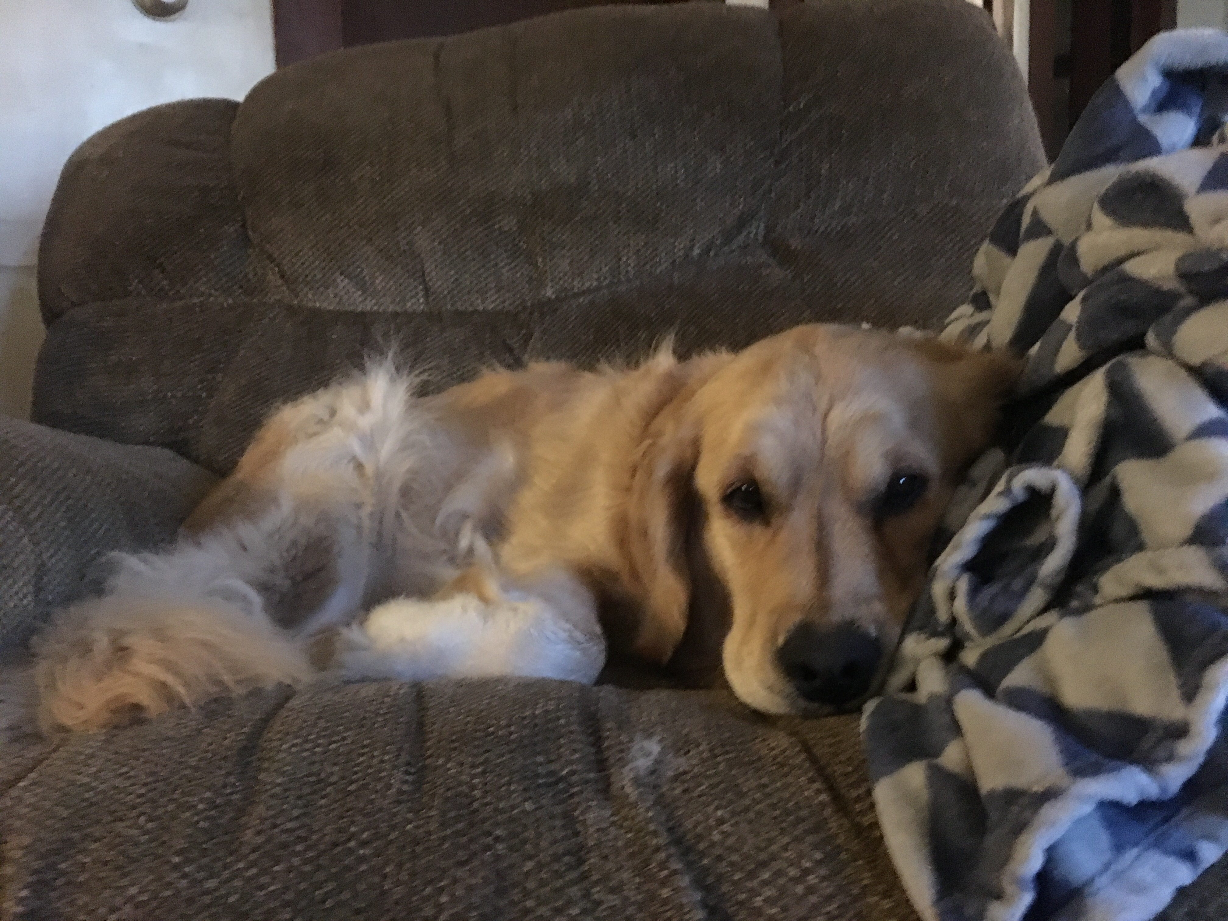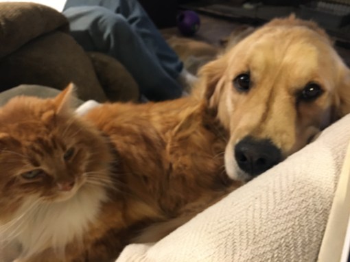 • Well, Belle started giving Linus kitty Golden Retriever lessons when he joined our family at 6 weeks old, so he’s pretty much a dog. And Lucy kitty is the family matriarch. Bess does bark at her but usually after Lucy agitates her.