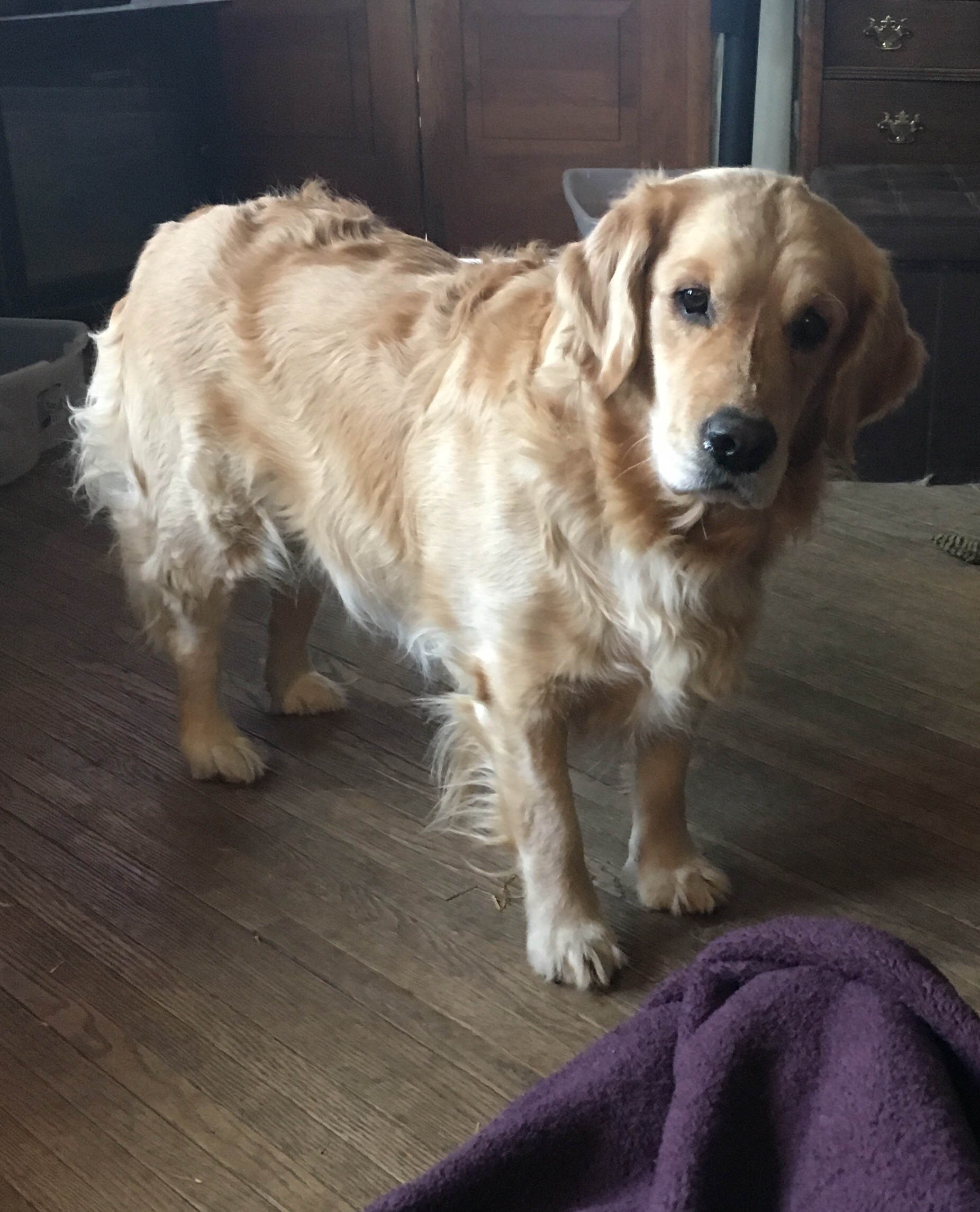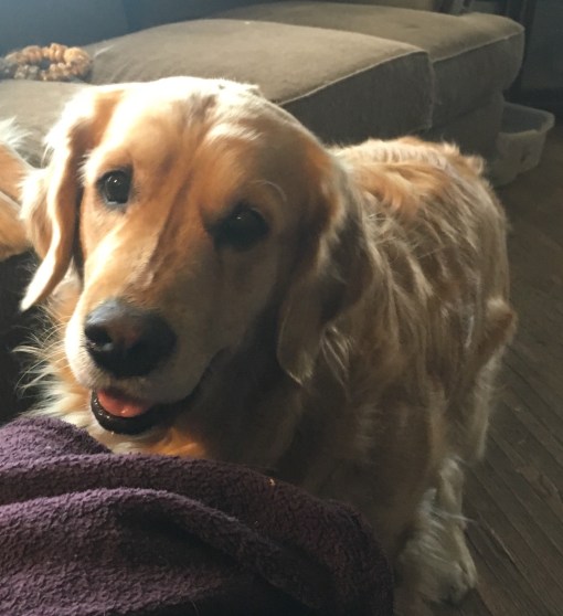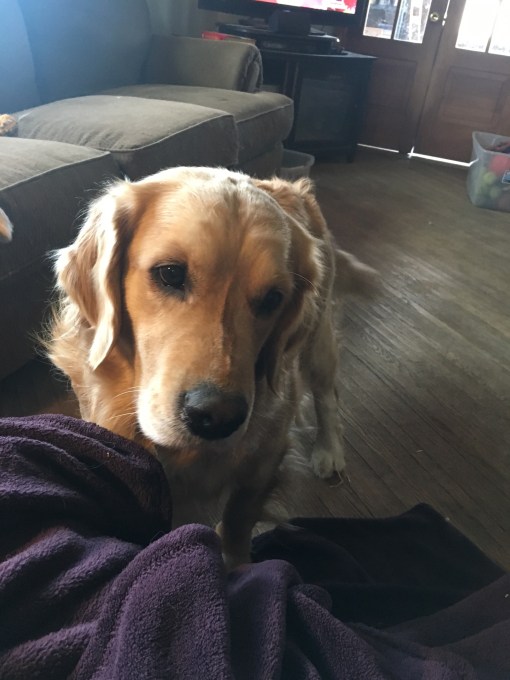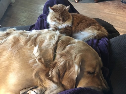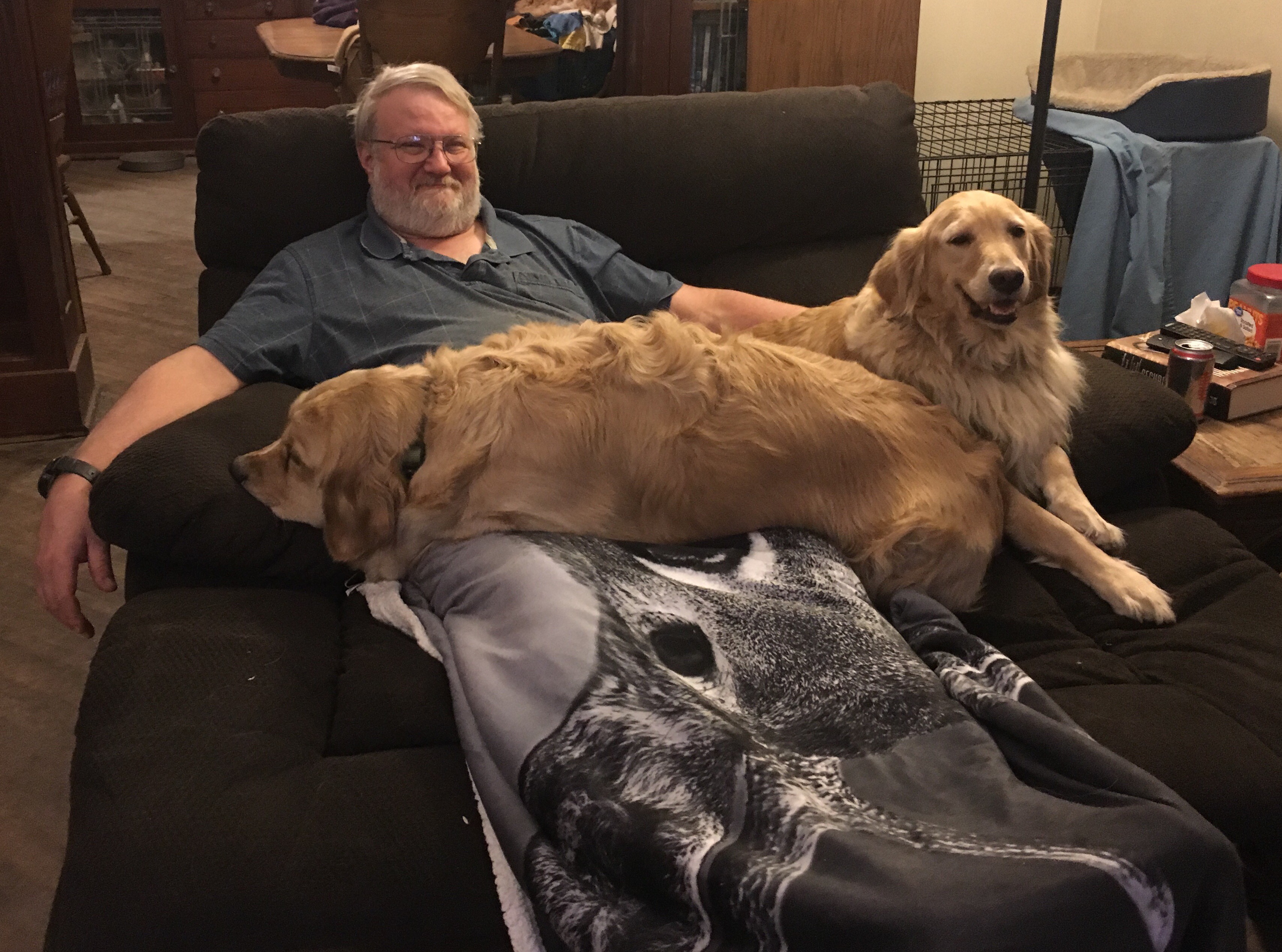 • Lucy just climbed up into her Dad’s lap in a chair last night while Xena hopped up and down wanting up too. I can’t imagine having 3 large dogs wanting to do that, plus 2 cats! Your dad figured out a good solution.