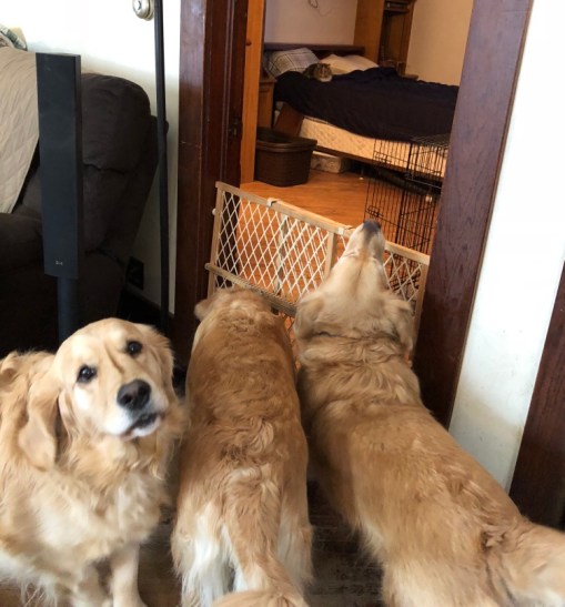1. We have 3 dogs too and 2 cats, our cats get a special place away from the dogs where they can come and go as they please. They need their special area sometimes the dogs can be overwhelming and annoying to them 😛