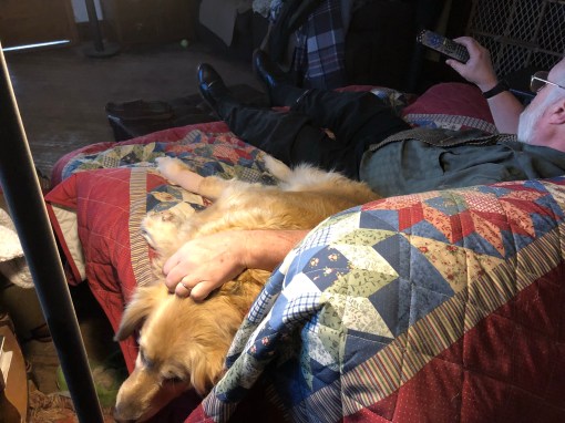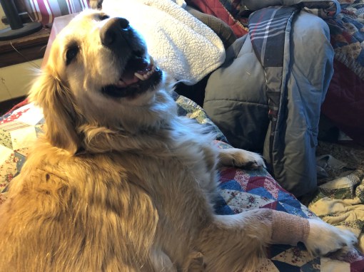 When My Margret wanted to put the other medicine on my paw and wrap it for a few minutes so I wouldn’t lick it off instead of laying down and letting her take care of me I heard My Greg come in and ran to him to let him know that I needed his support while she medicated and bandaged my paw. After that because someone needs to distract me so I don’t chew the bandage off I knew only My Greg would do.
