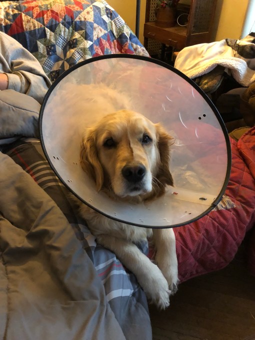 My Margret noticed I had been scratching my ear and then she saw my sisters lick at my ear. Seems that I have a quarter size owie on the underside of my ear flap along with all the signs of an ear infection. The cone is so my sisters can’t keep licking my ear. My Margret said I would soon be cone less and that both Belle and I would be feeling better. I hope she’s right.