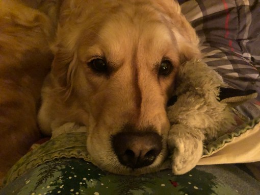 Once we climbed back into bed Bonnie curled up next to her and I laid on top of her and we both gave her lots of “thank you for letting us play in the early, very early morning rain “licks.