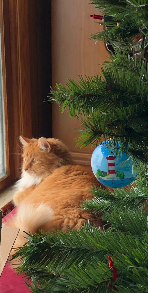 Linus, you do look beautiful laying in the sunshine, looking out the window. And what a great shot of the Christmas bulb. It makes it look like you are wishing for warmer weather by the seashore. π Happy New Year, dear girl.
