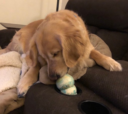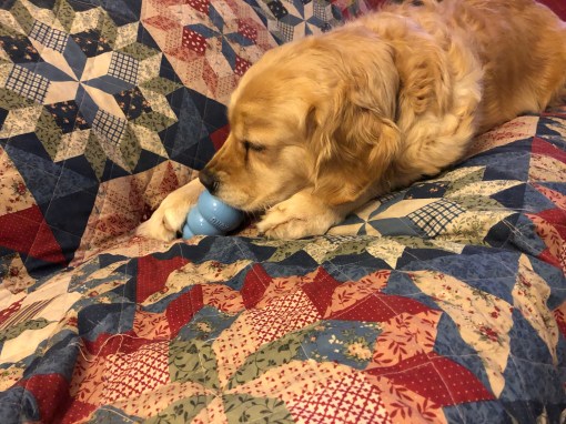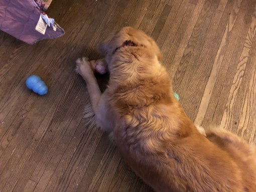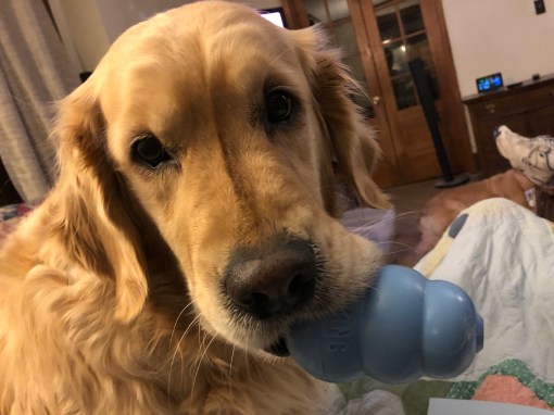 We all love peanut butter stuffed Kongs. Um…but I may love them a little bit more than my sisters. My Margret fixed three of them and laid them on the floor so we could each pick one. I may have picked all three of them before my sisters could pick one. (Note the green one by my right shoulder)