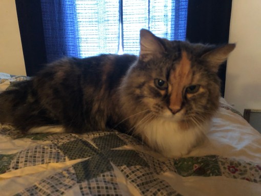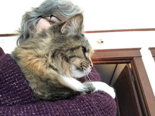 I usually stay in my room but I decided to go out to my favorite warm register in the living room. Bessie Pup started barking at me so My Margret body blocked and scooped me up for a cuddle. I didn’t get scared but started to purr so we stayed in the living room. Bessie stopped barking almost right away and laid down to think about it. I think she was confused.