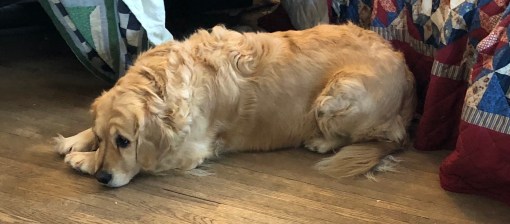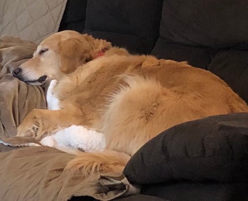 Linus is resting on his paw.