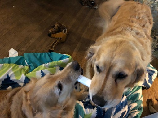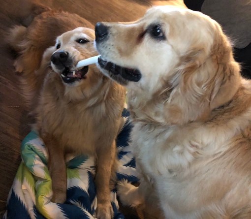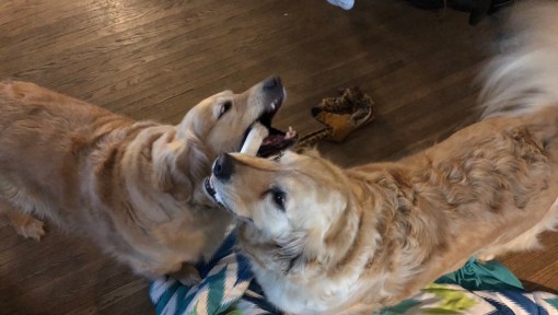 And my sisters are playing tug of war with a chew bone. Any guesses on who won?