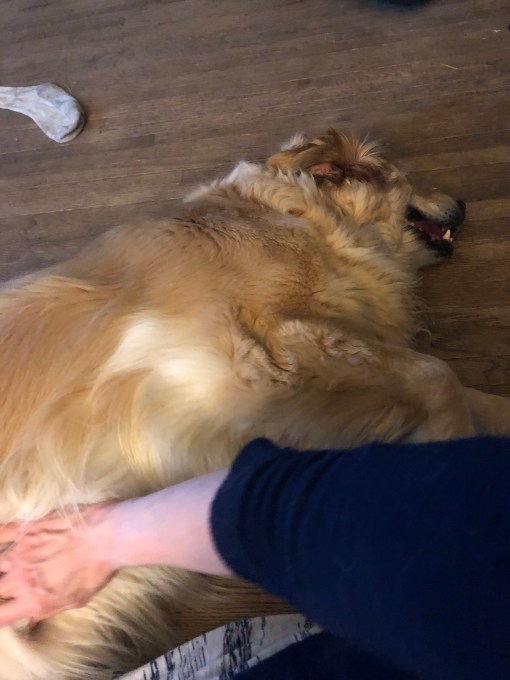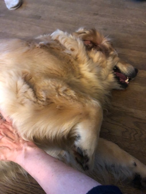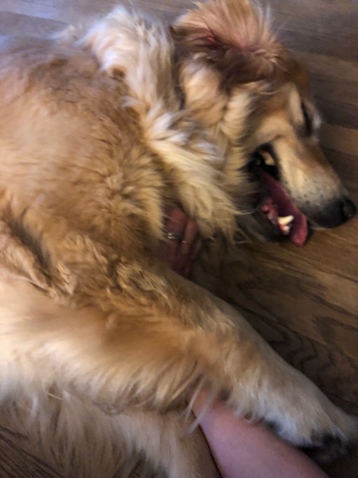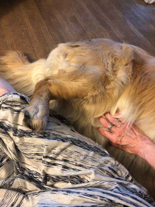 Before you could say cheese please my sisters went out to the pup porch and My Margret had gathered up my yucky ear fixer stuff. She always lets me find where I want to lay down and I always invite her to rub my tummy instead, it’s what we do. Ten million goopy cotton balls later and a squirt of some medicine in each ear she said ” Belle, I will rub your tummy until you get tired of it. And she did.