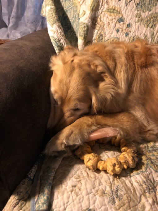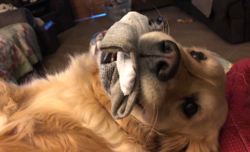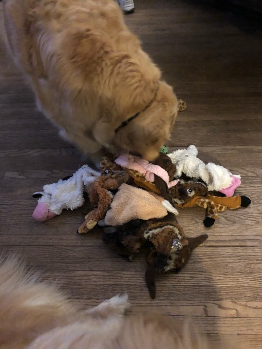 My Margret asked me to go get a stuffie and I nosed it over to her instead of picking it up in my mouth. She asked me again for one and again I nosed it over to her. That’s when she realized that they were too stinky even for me and I started carrying My Greg’s socks.
