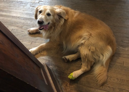 Every time I go outside My Margret has to put a plastic bag on my bandaged foot. I don’t like it very much because I forget and wag my tail and some of my tail hairs get caught in the tape.