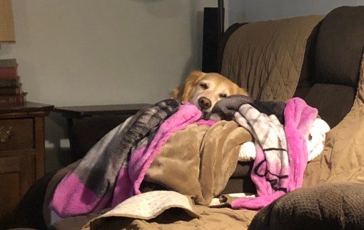 When we come back in the house I sit real still so she can cut the tape and get that bag off of my foot. Then I go do my new job. Bonnie made being a pillow tester look so easy that I decided to become a blanket tester