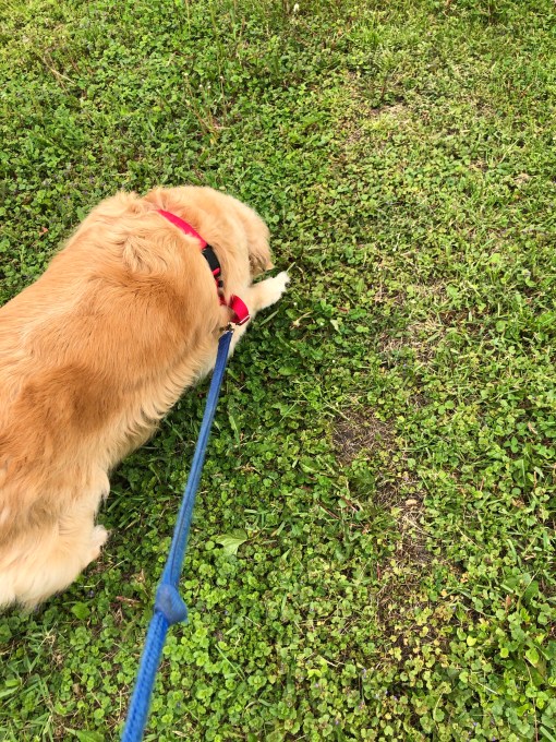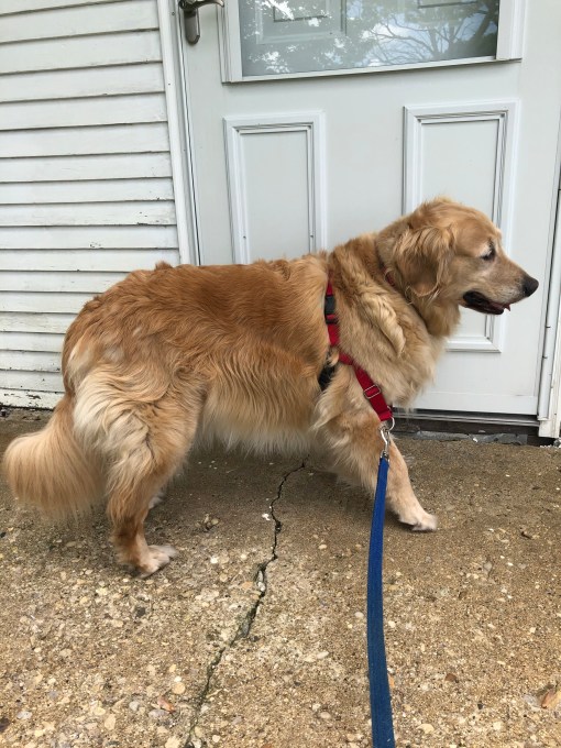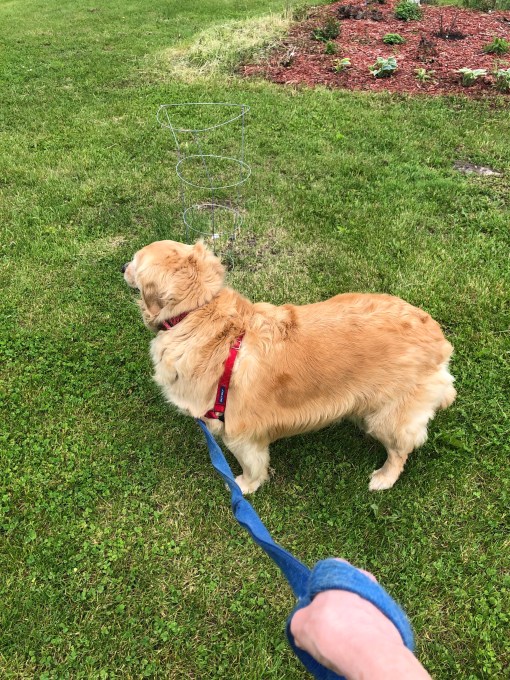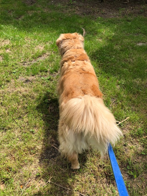 After we went in My Margret took my harness off, ruffled my ears and then she headed back outside. I decided that I wanted to go back out and trotted right along behind her. My Margret laughed and went to get my harness again and off we went …again.