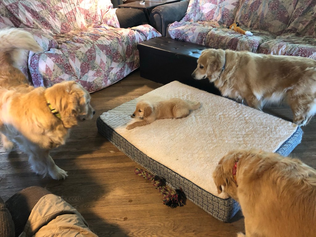 1. That first picture in a winner. Little Bea steals the bed with 3 adult Golden’s standing around looking at her. Yes, sweetheart, you really do think you are bigger than you are, and so far it’s working. XOX Amy