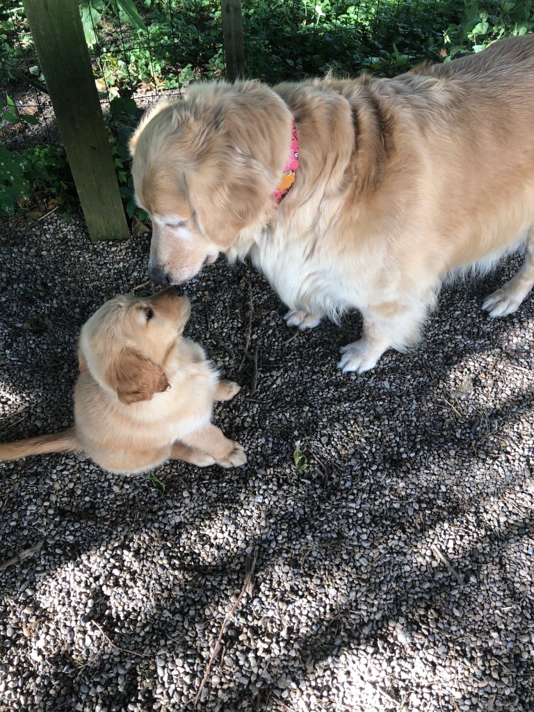 Bonnie has had the easiest time getting used to Bea. Of course she loves Bea’s toys and always tries to steal them. She will correct Bea when she chews too hard on her but is by far the most tolerant of the three older pups of the puppy antics. ~My Margret