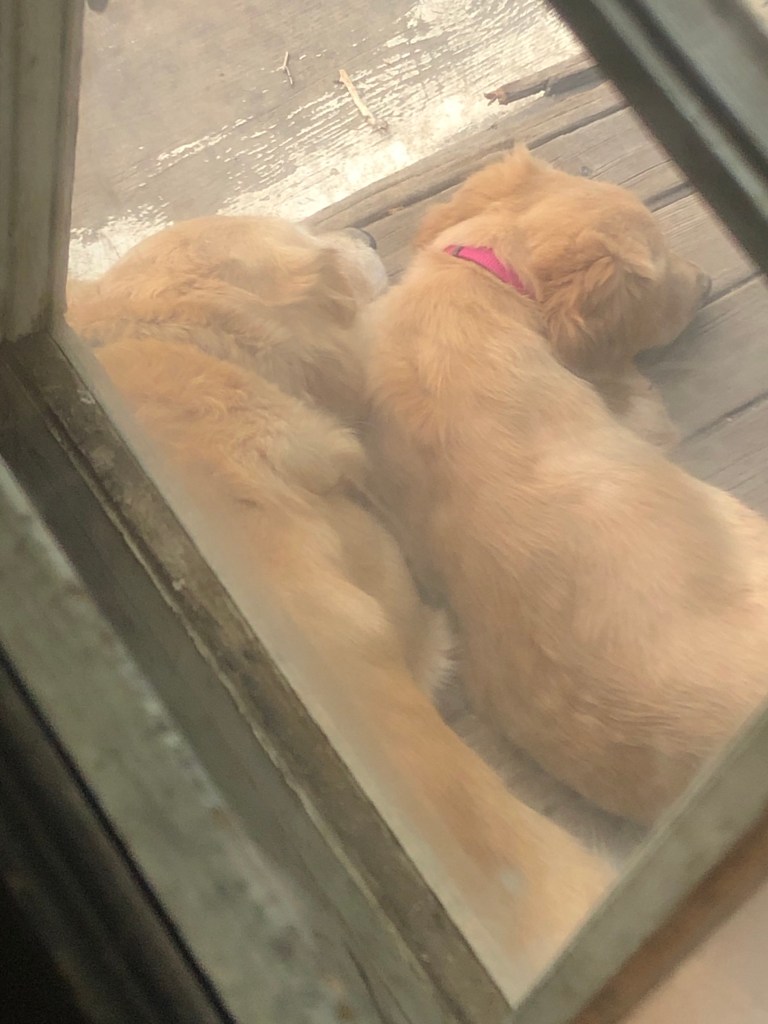 As folks know Bea puppy instantly bonded with Bonnie Pup while Belle and Bessie Pups tended to not be as tolerant of the frisky youngster. Today Greg looked through the window of the pup porch door to see Belle and Bea snuggled together. Looks like Belle is stepping up to the big sister plate for Bea Puppy. Yes, it brought tears of happiness to see this. The healing begins ~ the pups My Margret