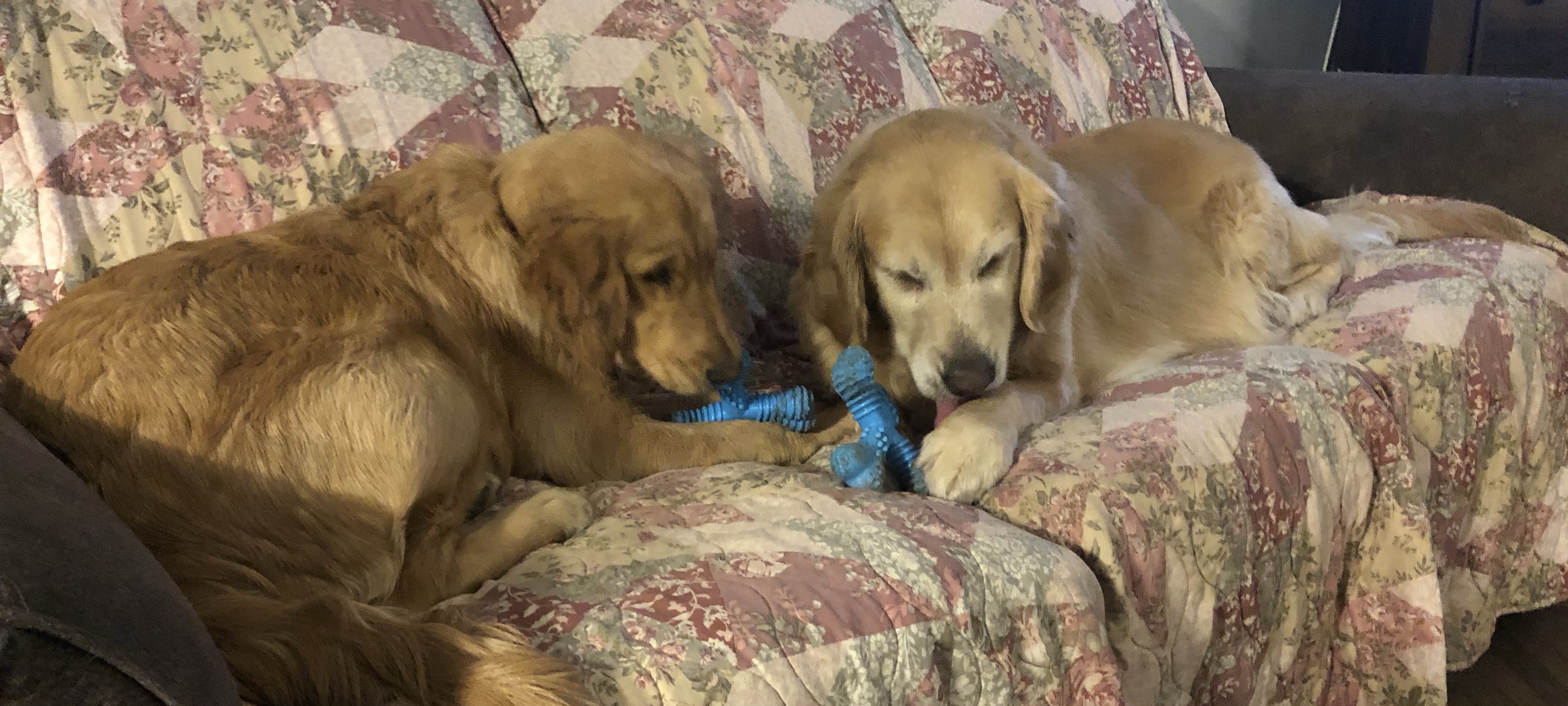 Bea: If I’m quiet I bet I can get Belle’s chewy toy too. Belle: I’m done with the toy for now so I’ll help Bea practice her stealth skills.