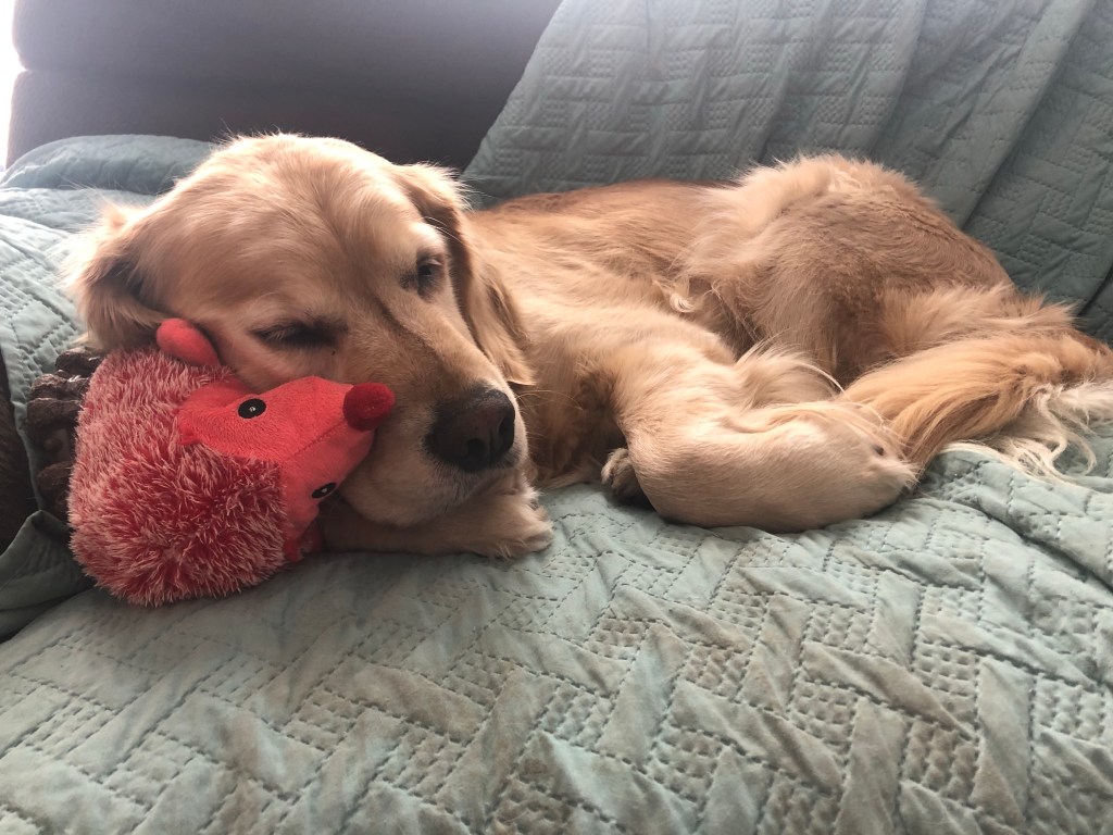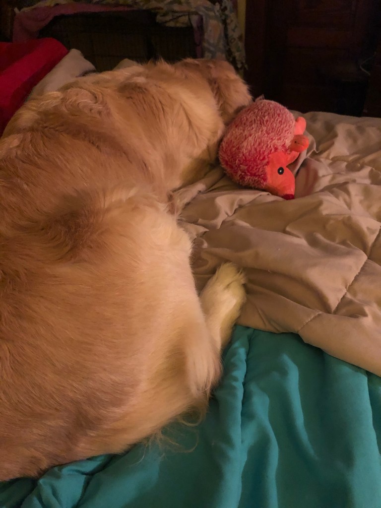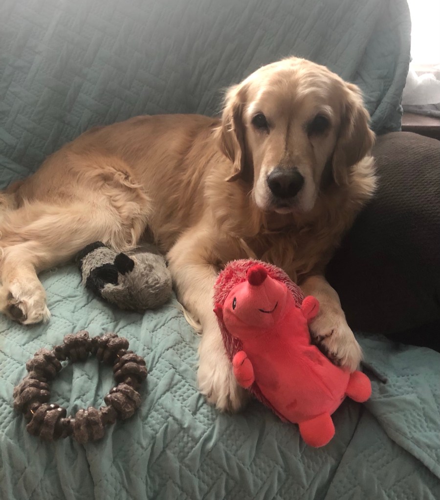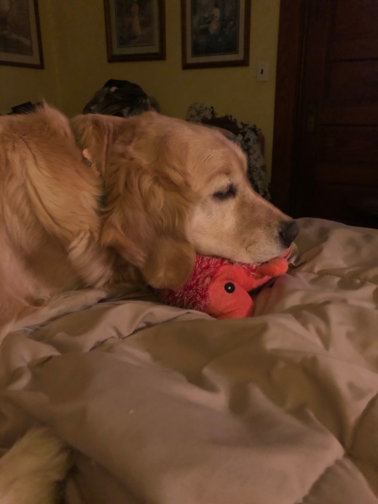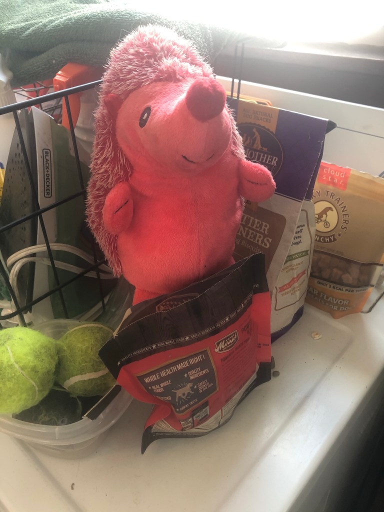 I patiently wait right by the pup porch door with all the other special things so she sees me as soon as she comes in.