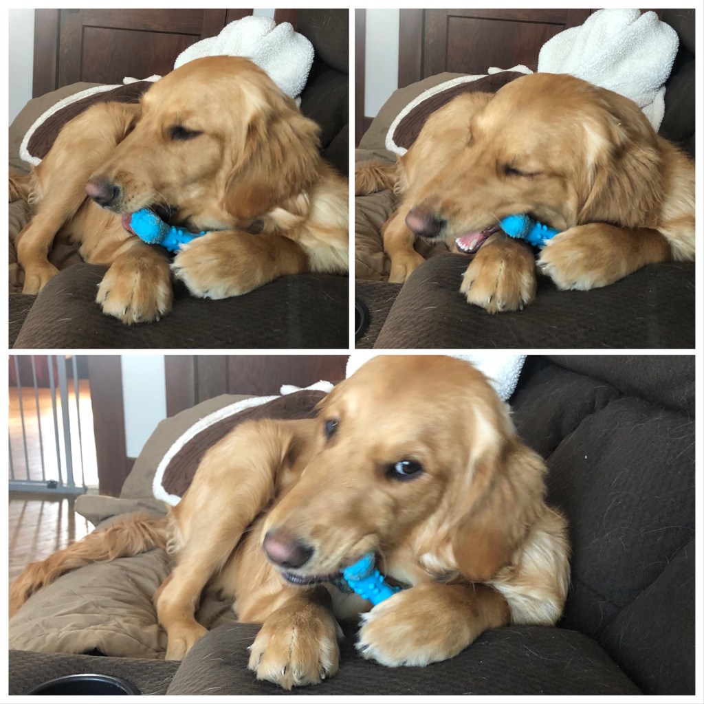 You’re a very good girl to chew your rubber bone and not the furniture. Our Mom wishes we had learned that earlier than we did. Reminder to not swallow any of it (the bone, not the furniture). XOX Lucy and Xena