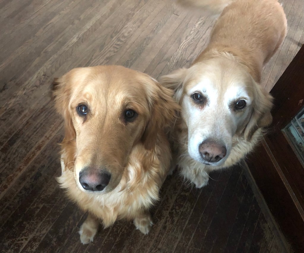 We saw you pick up the treat bag so we’ll just stay close in case you drop any. ~Bea (L) and Belle (R) Pups