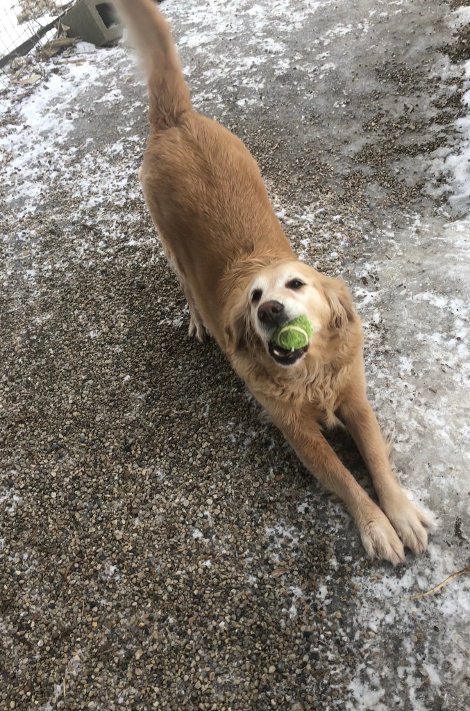 Multi tasking at its finest. Stretching without dropping the tennis ball. ~Belle Pup