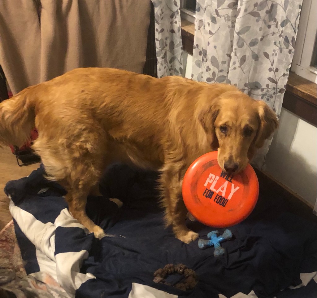 I don’t understand. The wind blew the orange round flying things down, so I brought one in the house to chew on it. When you told me to “give” I gave you that one (finally) then I ran back out to bring this one in. Why can’t I chew it up into little hard jagged pieces? It says “play” on it. Sigh… I know I know “give”. ~ Bea Puppy