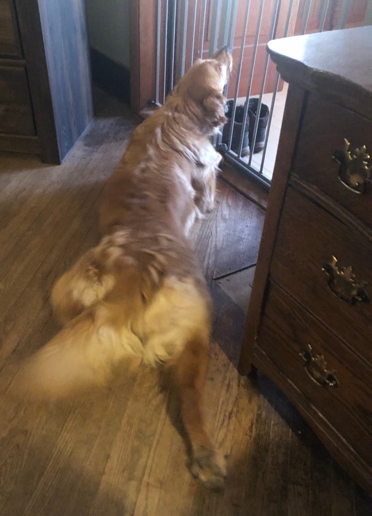 But I want to chew on Greg’s boots. Why oh why did you put them where I can’t reach them. (whine, yip, pout… repeat) ~ Bea Puppy
