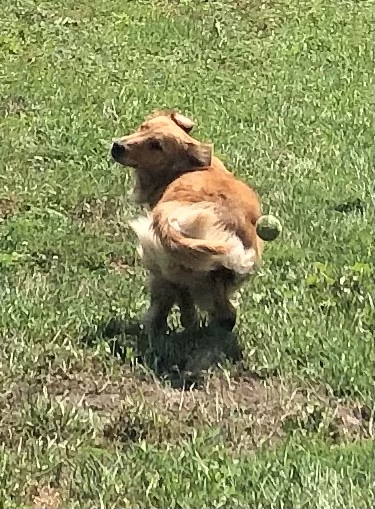 Where’d it go? Where’s the ball?!?!?! ~ Bea Pup. (note: the ball did not hit Bea. She was in mid twirl and it landed next to her.)