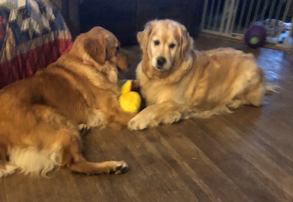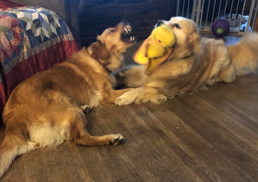 Bessie, I’ll pretend I’m a dinosaur trying to get your toy but you don’t let me ok? Oh and we have to touch paws and can only move our heads. ~ Bea and Bessie Pups (When you’ve been roughhousing and are tired but still want to play.🤣)