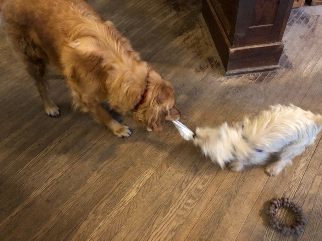 Today’s task: Checking the stretchability of Our My Greg’s sock. ~ Bea Pup and Scruffy Puppy
