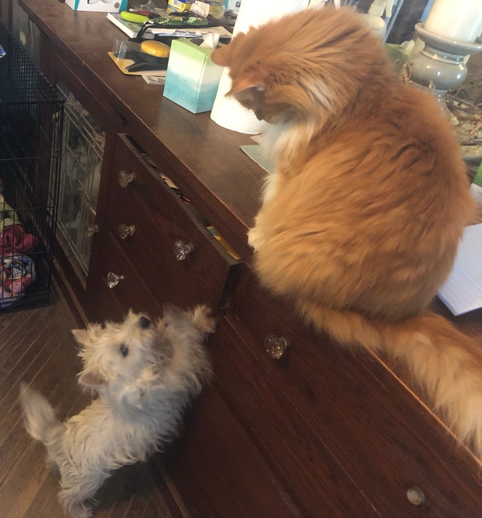 That is so funny! I love the way Linus Kitty is trying to reach the Scruffy Puppy. Do you think Linus Kitty will ever get to the puppy?