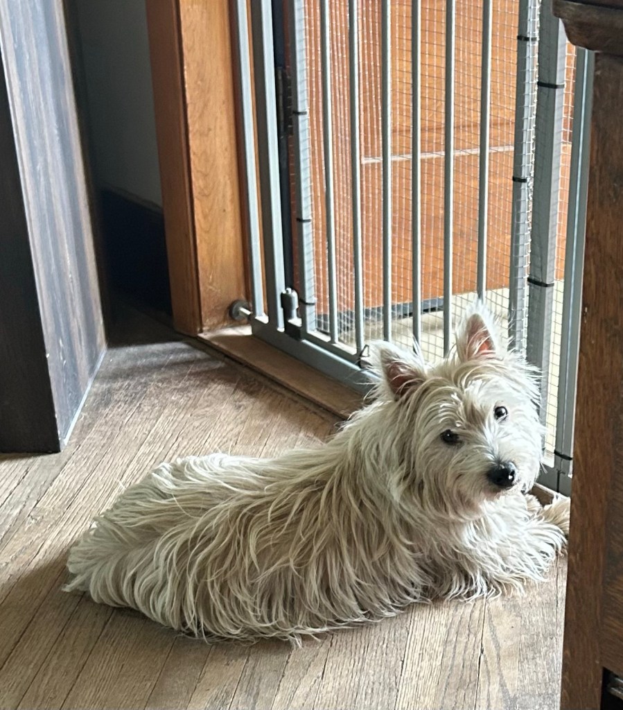 What am I doing? I’m staring at the gate door to make it open faster for breakfast! There’s a whole 2-1/2 seconds to go and my tummy says that’s too long! ~ Scruffy Puppy