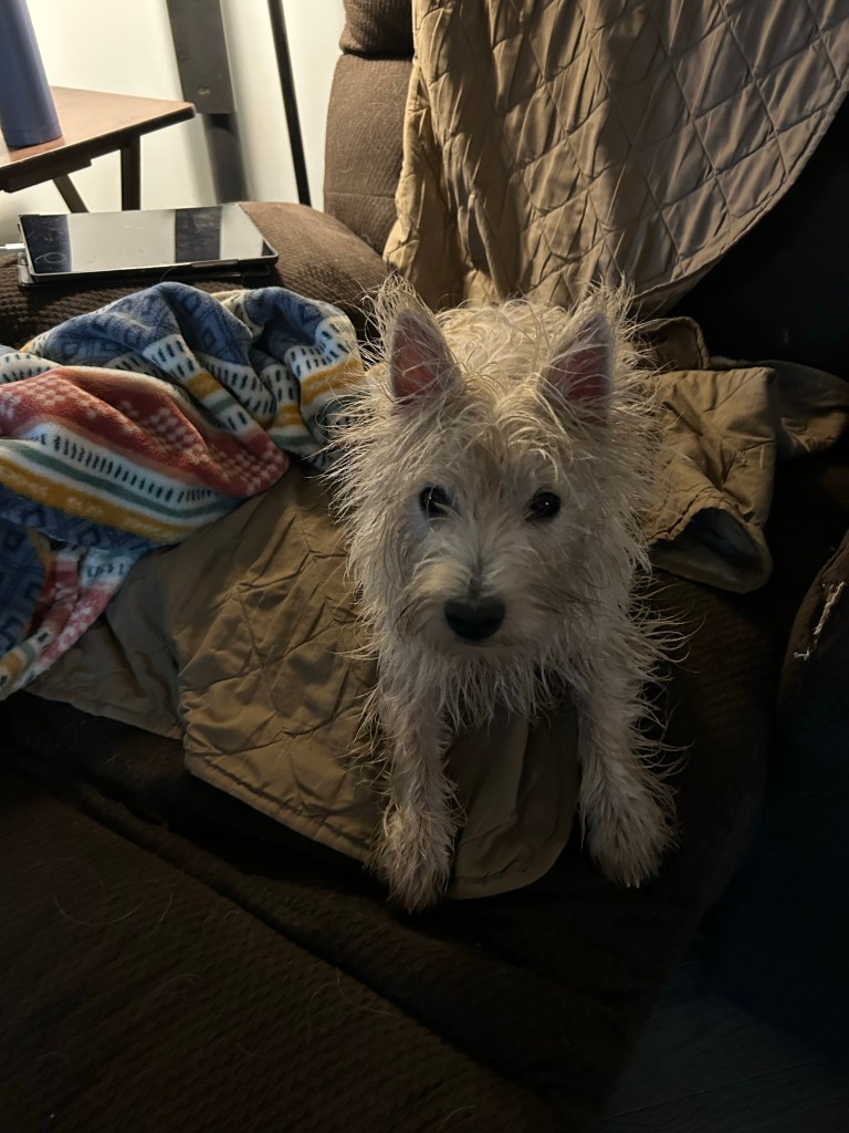 You gave me a bath to wash off all of that glorious mud so I’m drying off in your recliner. Ha! The terrier gets the last laugh!! Um, you’re going to come sit with me right? ~ Scruffy Pup