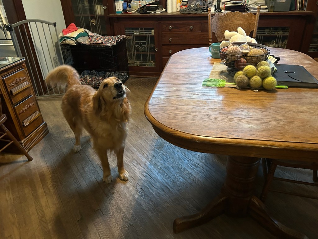 (note: the lost treasure trove of tennis balls were discovered while I was sweeping under the living room furniture. A few minutes later Bea found them and started to bark her “hurry, let’s play” bark. You know what happened next. 😉)