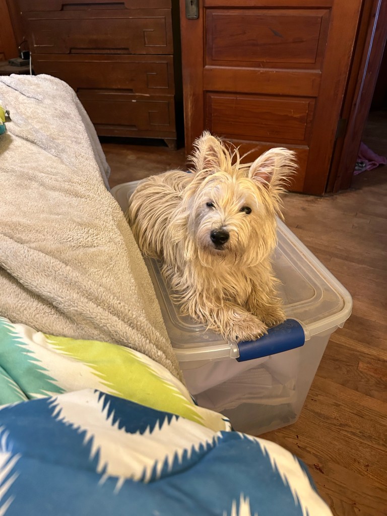 The other day I wanted to cuddle with My Margret. I tried to jump up on the bed but it’s too tall and I bounced back hard to the floor. Yesterday My Margret put this tote there to help me. I barked at it A LOT but eventually the climby thing and I came to an understanding and I figured out how to jump up on it. I couldn’t believe how easy it was to jump up on the bed after that. My Margret says training treats are a wonderful thing, I agree keep them coming!