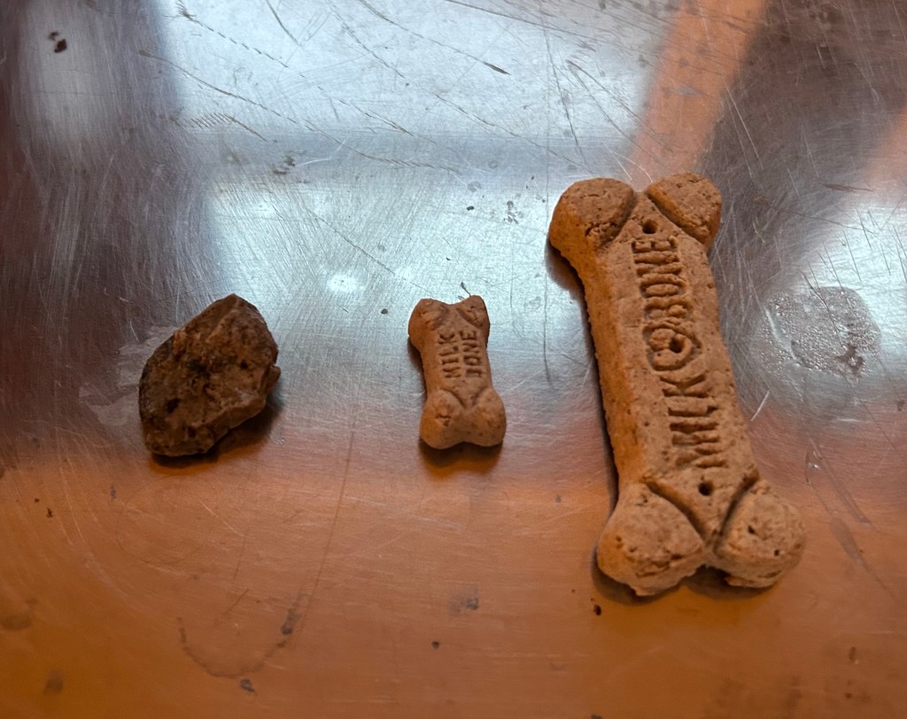 I brought in a rock to show My Margret this morning but Scruffy wanted to roughhouse while I had the rock in my mouth. So My Margret decided to trade a treat for my rock.