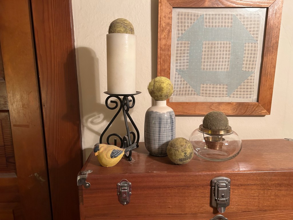 I like to take the tennis balls upstairs so My Margret and I can play ball during the night. She says she doesn’t want a tennis ball bouncing off of her head when she’s sleeping so when she finds them she puts them up high where I can’t reach them. Does that mean I’m the decorator pup now? ~ Bea Pup